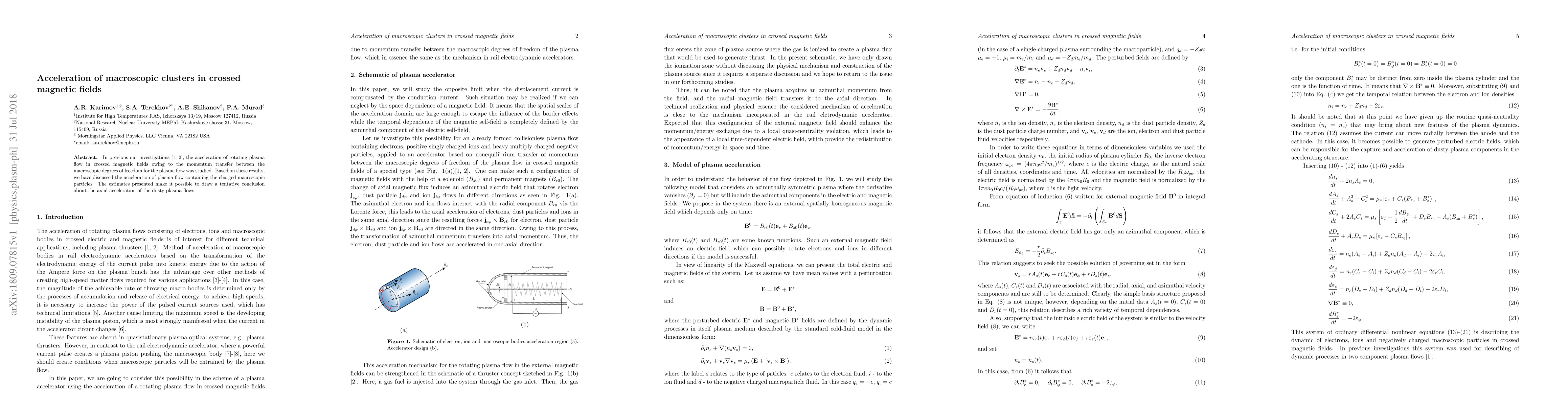 This paper investigates the acceleration of rotating plasma flow in crossed magnetic fields, focusing on the momentum transfer between macroscopic degrees of freedom. The findings suggest a potential for axial acceleration in dusty plasma flows.