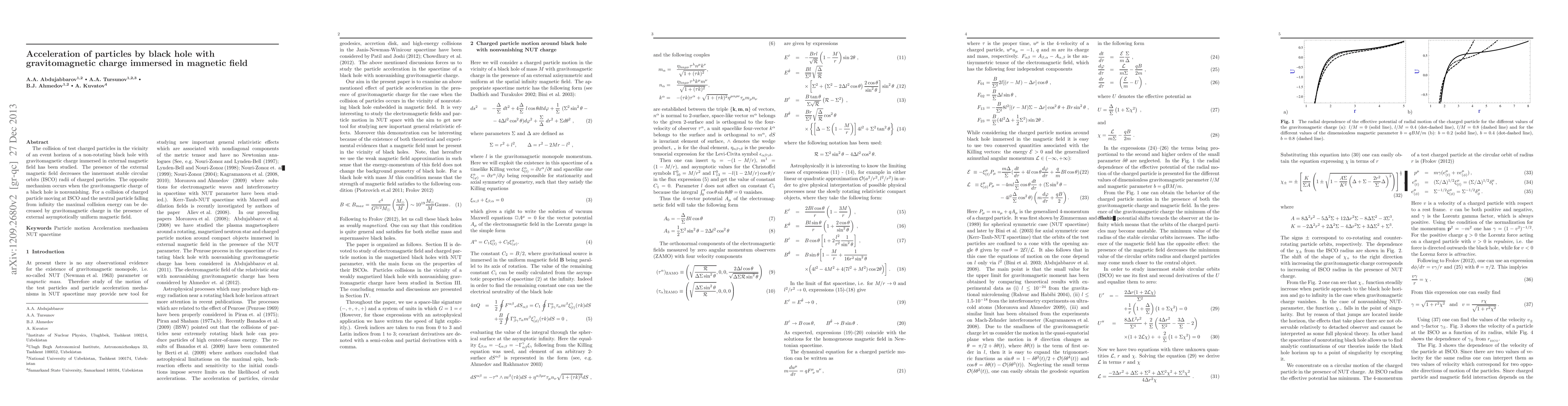 Summary: The study investigates how charged particles near a weakly magnetized black hole with gravitomagnetic charge behave in an external magnetic field, finding that it decreases innermost stable circular orbit radii. Gravitomagnetic charge can reduce maximal collision energy when charged particles collide with neutral particles falling from infinity.