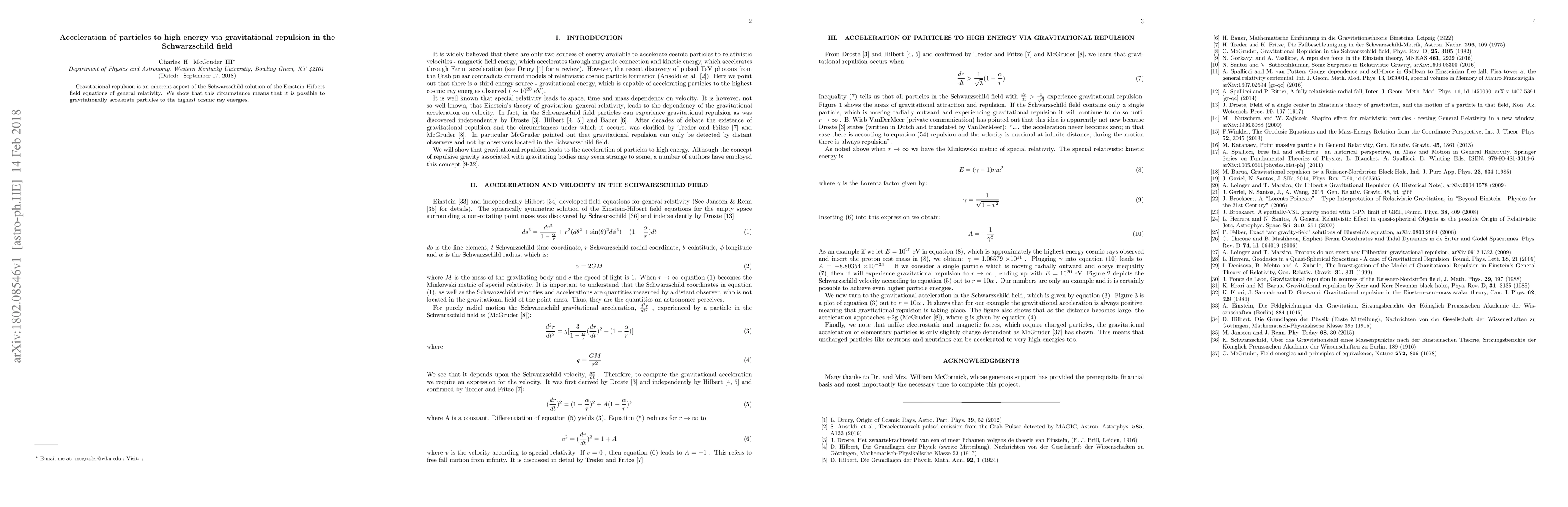 Gravitational repulsion is an inherent aspect of the Schwarzschild solution of the Einstein-Hilbert field equations of general relativity. We show that this circumstance means that it is possible to gravitationally accelerate particles to the highest cosmic ray energies.
