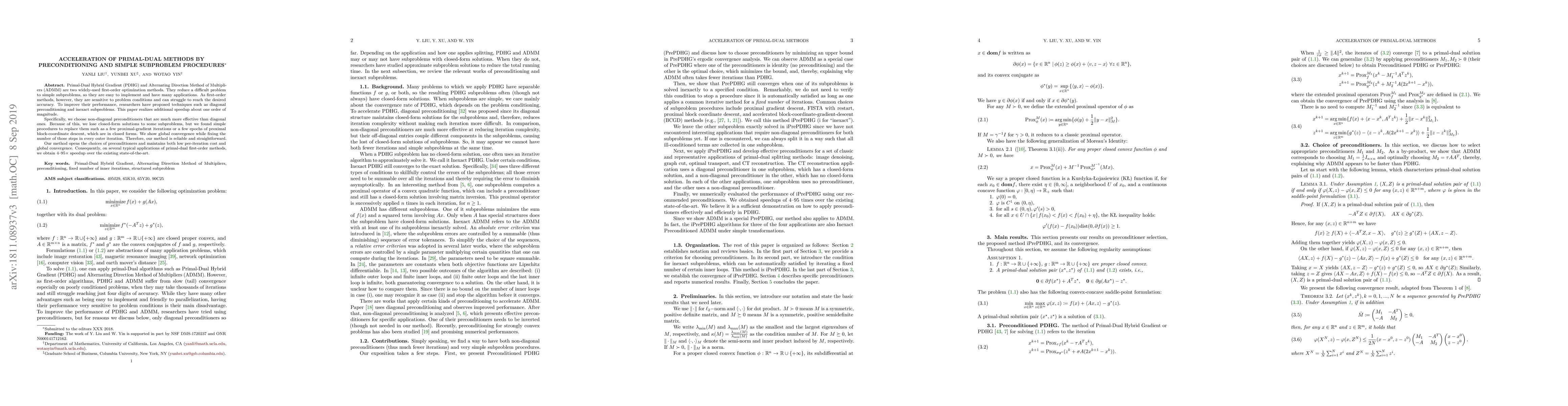 This paper proposes advanced preconditioning and simple subproblem procedures to significantly accelerate Primal-Dual Hybrid Gradient (PDHG) and Alternating Direction Method of Multipliers (ADMM) methods, achieving up to one order of magnitude speedup. The use of non-diagonal preconditioners and simple iterative procedures ensures global convergence and maintains low per-iteration costs.