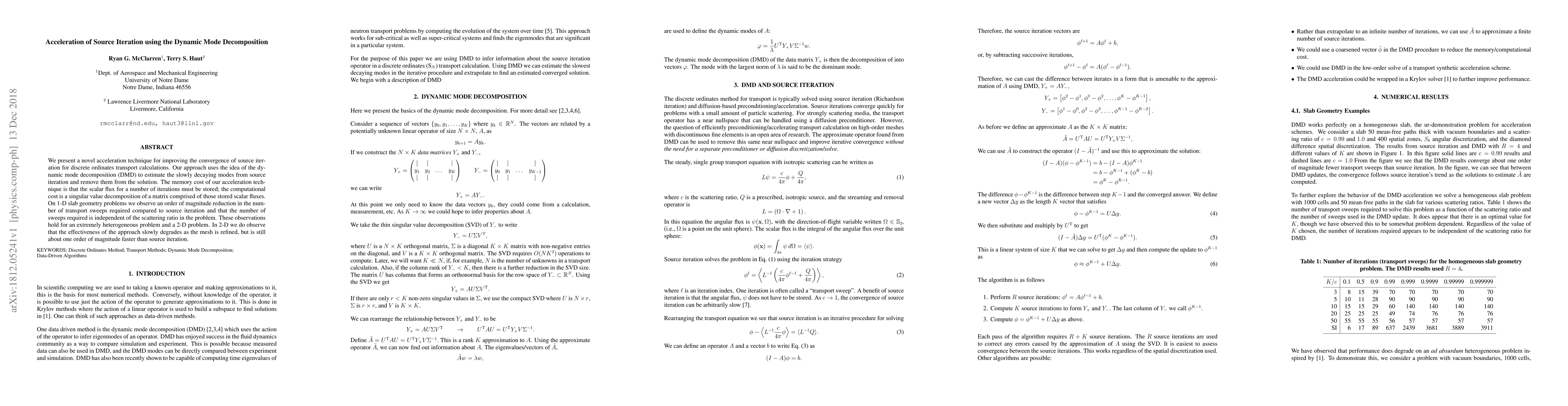A new method accelerates source iteration for discrete ordinates transport calculations by removing slowly decaying modes using dynamic mode decomposition, reducing the number of sweeps required by an order of magnitude in 1-D slab geometry problems.