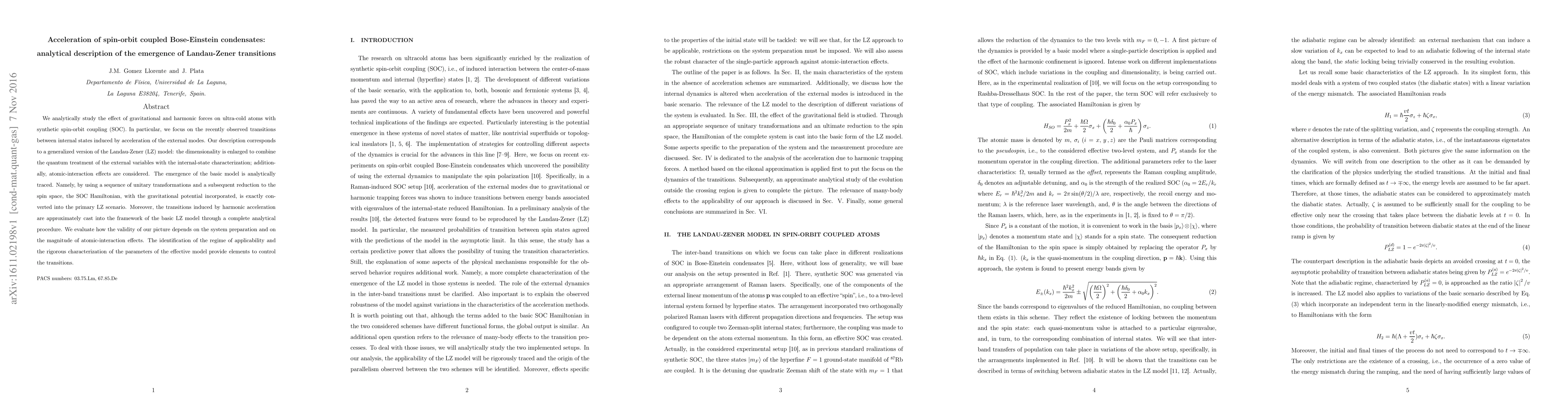This research analytically describes how gravitational and harmonic forces affect ultra-cold atoms with synthetic spin-orbit coupling, leading to transitions between internal states due to acceleration. It generalizes the Landau-Zener model by integrating quantum treatment of external variables and internal-state characterization, also accounting for atomic interactions. The study traces the basic model's emergence and evaluates the applicability of this approach based on system preparation and atomic-interaction effects, offering insights for controlling these transitions.