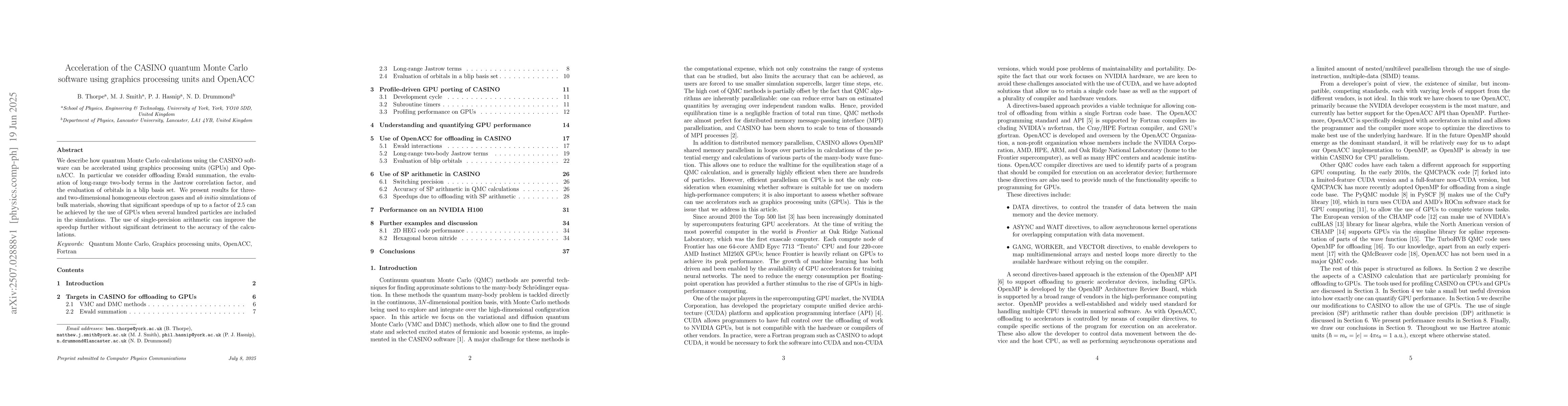 This paper details how the CASINO quantum Monte Carlo software can be accelerated using GPUs and OpenACC, particularly for Ewald summation, Jastrow correlation, and blip basis set evaluations. Results show speedups of up to 2.5 for simulations with hundreds of particles, with single-precision arithmetic offering further improvement without significant loss of accuracy.