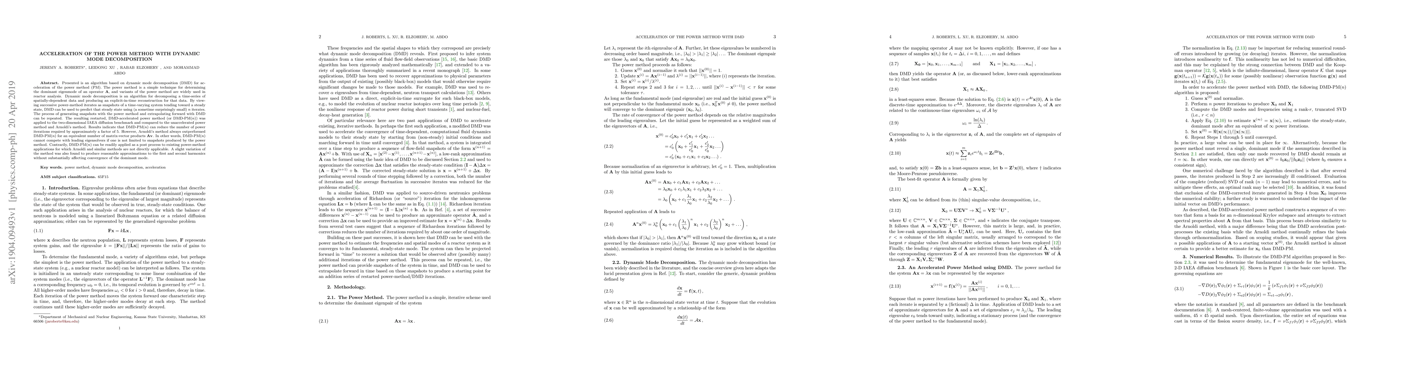 A new algorithm combines dynamic mode decomposition with the power method to accelerate eigenvalue computation, reducing iteration counts by a factor of 5 in some cases, but noting limitations compared to established methods like Arnoldi's method.