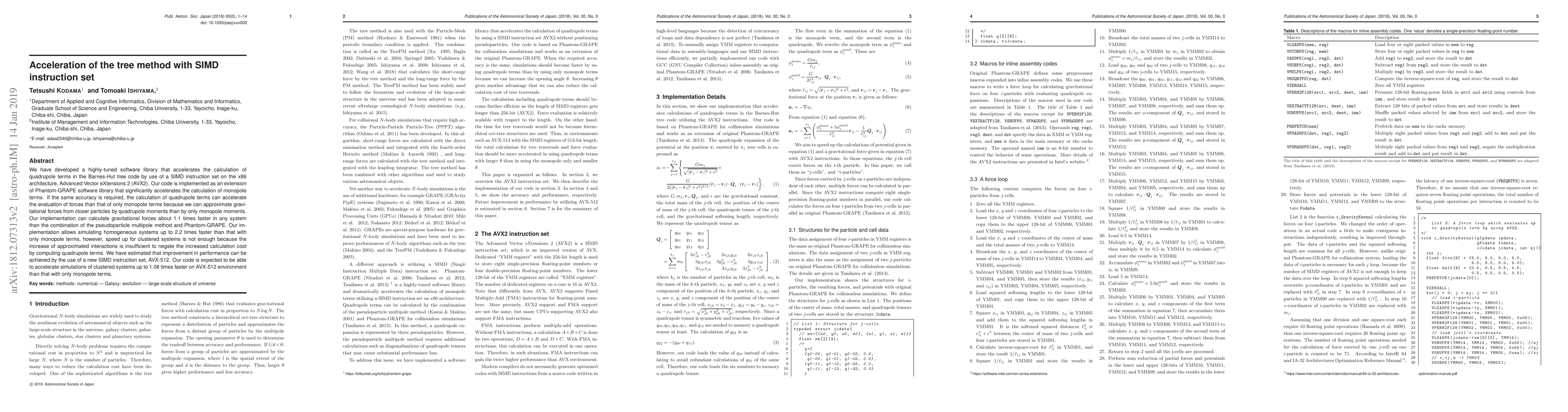 This paper presents a software library that accelerates the calculation of quadrupole terms in the Barnes-Hut tree code using AVX2 SIMD instructions, achieving about 1.1 times faster force calculations compared to pseudoparticle multipole methods and Phantom-GRAPE. While it significantly speeds up homogeneous systems, clustered systems see limited benefits due to increased computation costs for quadrupole terms. The authors suggest potential further improvements with AVX-512.