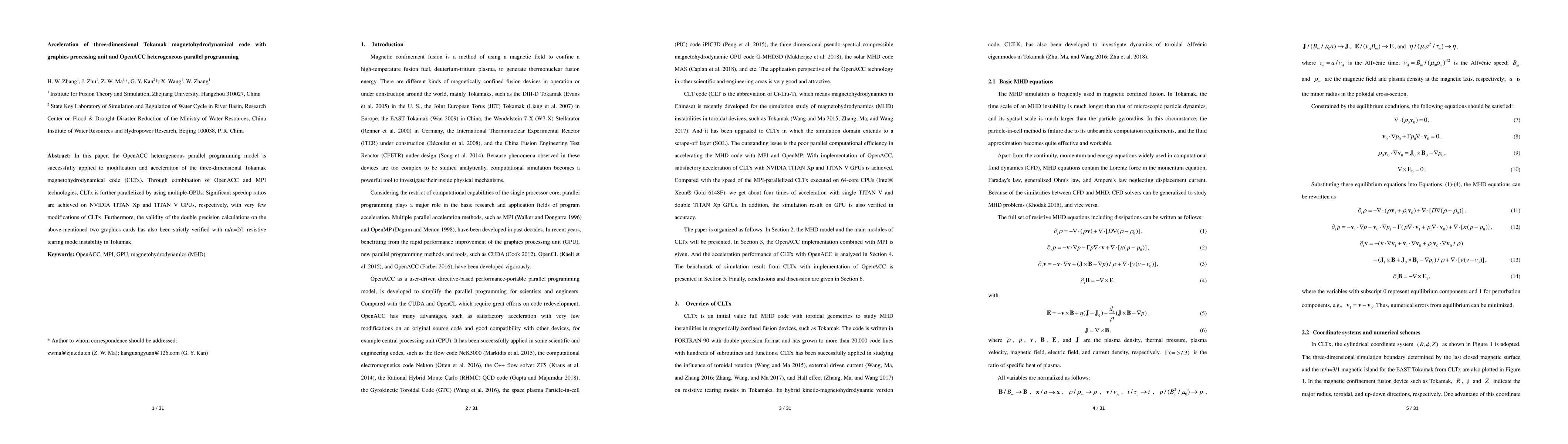 In this paper, the OpenACC heterogeneous parallel programming model is successfully applied to modification and acceleration of the three-dimensional Tokamak magnetohydrodynamical code (CLTx). Through combination of OpenACC and MPI technologies, CLTx is further parallelized by using multiple-GPUs. Significant speedup ratios are achieved on NVIDIA TITAN Xp and TITAN V GPUs, respectively, with very few modifications of CLTx. Furthermore, the validity of the double precision calculations on the above-mentioned two graphics cards has also been strictly verified with m/n=2/1 resistive tearing mode instability in Tokamak.