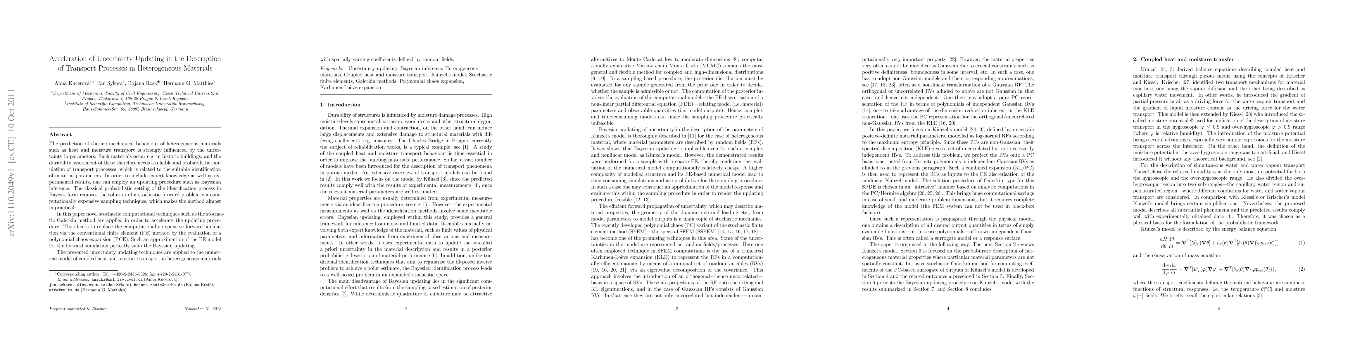 This paper proposes novel stochastic computational techniques, such as the stochastic Galerkin method, to accelerate uncertainty updating in the simulation of transport processes in heterogeneous materials like historic buildings. The paper replaces conventional finite element methods with polynomial chaos expansion to make Bayesian updating more practical.