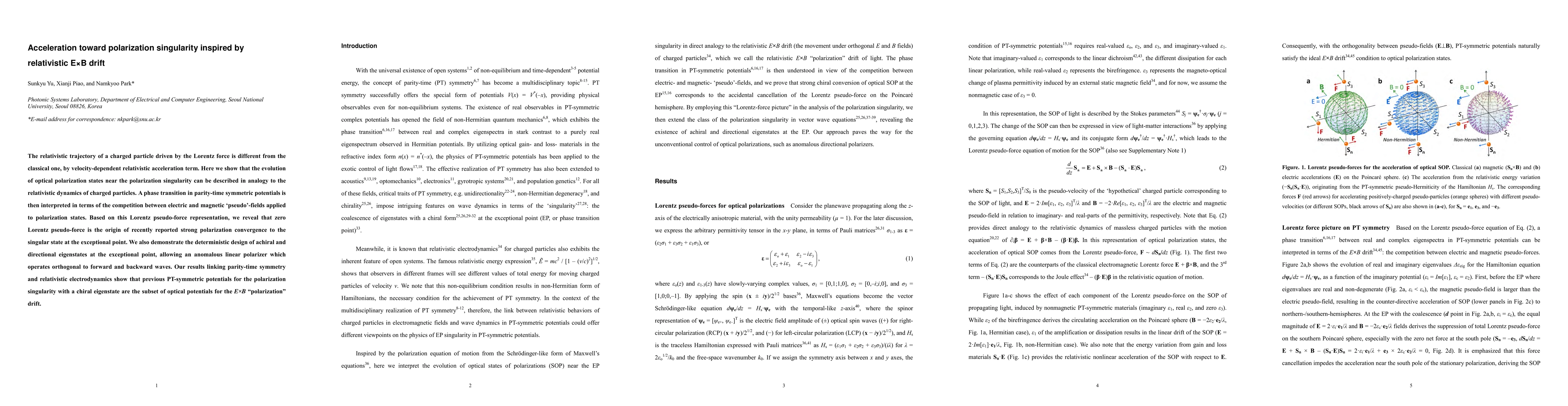 The relativistic trajectory of a charged particle driven by the Lorentz force is different from the classical one, by velocity-dependent relativistic acceleration term. Here we show that the evolution of optical polarization states near the polarization singularity can be described in analogy to the relativistic dynamics of charged particles. A phase transition in parity-time symmetric potentials is then interpreted in terms of the competition between electric and magnetic 'pseudo'-fields applied to polarization states. Based on this Lorentz pseudo-force representation, we reveal that zero Lorentz pseudo-force is the origin of recently reported strong polarization convergence to the singular state at the exceptional point. We also demonstrate the deterministic design of achiral and directional eigenstates at the exceptional point, allowing an anomalous linear polarizer which operates orthogonal to forward and backward waves. Our results linking parity-time symmetry and relativistic electrodynamics show that previous PT-symmetric potentials for the polarization singularity with a chiral eigenstate are the subset of optical potentials for the ExB "polarization" drift.