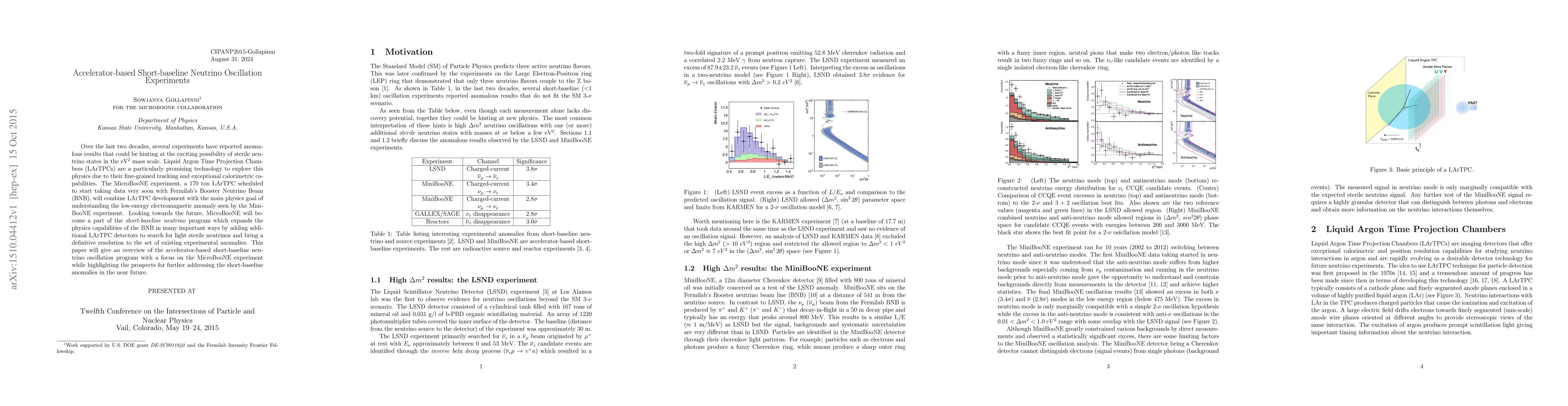 This paper reviews accelerator-based short-baseline neutrino oscillation experiments, focusing on the MicroBooNE experiment using Liquid Argon Time Projection Chambers to investigate potential sterile neutrinos and resolve anomalies observed in previous MiniBooNE experiments. Future plans include expanding the program to definitively address these anomalies.