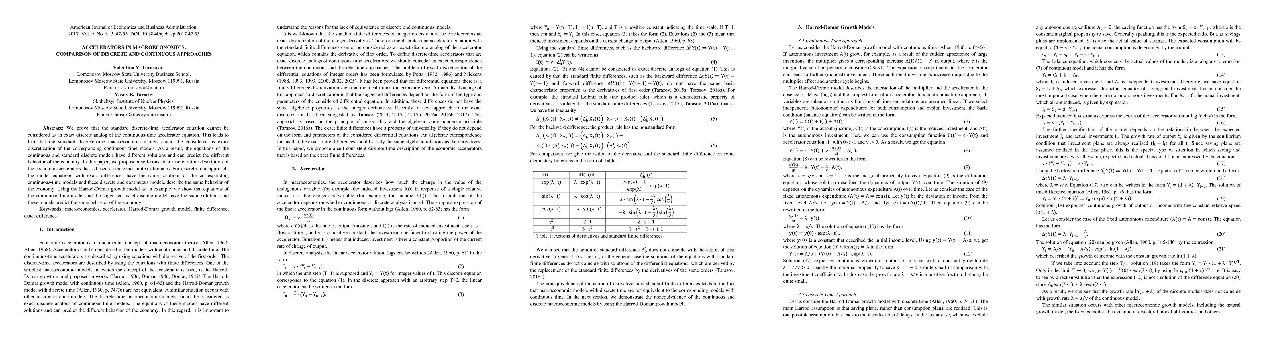 This paper demonstrates that the standard discrete-time accelerator equation is not an exact analog of the continuous-time version, leading to discrepancies in economic predictions. It proposes a self-consistent discrete-time model based on exact finite differences, showing that this model aligns with continuous-time models, as demonstrated using the Harrod-Domar growth model.