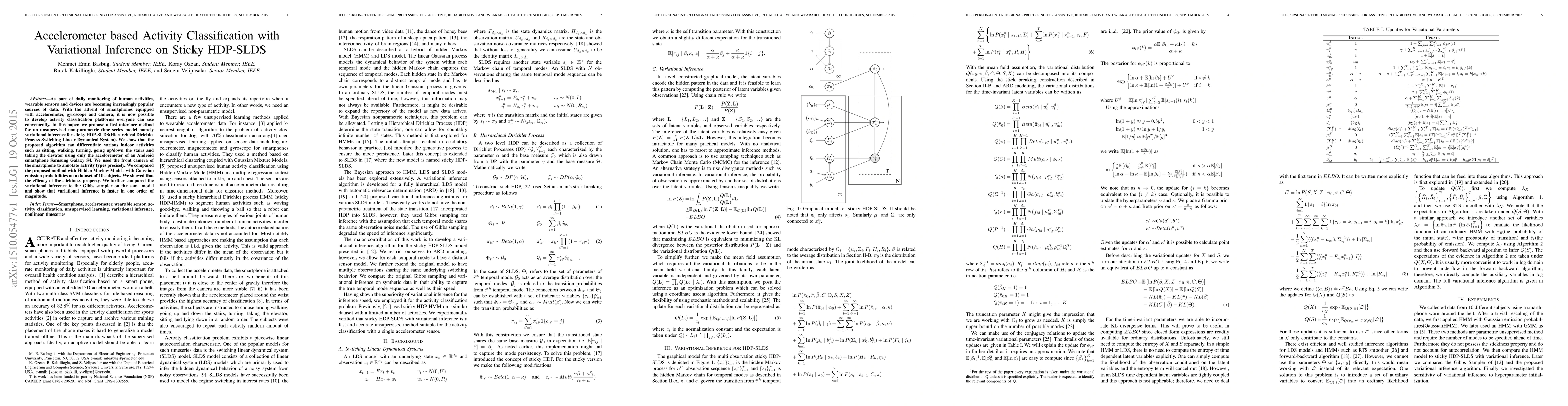 As part of daily monitoring of human activities, wearable sensors and devices are becoming increasingly popular sources of data. With the advent of smartphones equipped with acceloremeter, gyroscope and camera; it is now possible to develop activity classification platforms everyone can use conveniently. In this paper, we propose a fast inference method for an unsupervised non-parametric time series model namely variational inference for sticky HDP-SLDS(Hierarchical Dirichlet Process Switching Linear Dynamical System). We show that the proposed algorithm can differentiate various indoor activities such as sitting, walking, turning, going up/down the stairs and taking the elevator using only the acceloremeter of an Android smartphone Samsung Galaxy S4. We used the front camera of the smartphone to annotate activity types precisely. We compared the proposed method with Hidden Markov Models with Gaussian emission probabilities on a dataset of 10 subjects. We showed that the efficacy of the stickiness property. We further compared the variational inference to the Gibbs sampler on the same model and show that variational inference is faster in one order of magnitude.