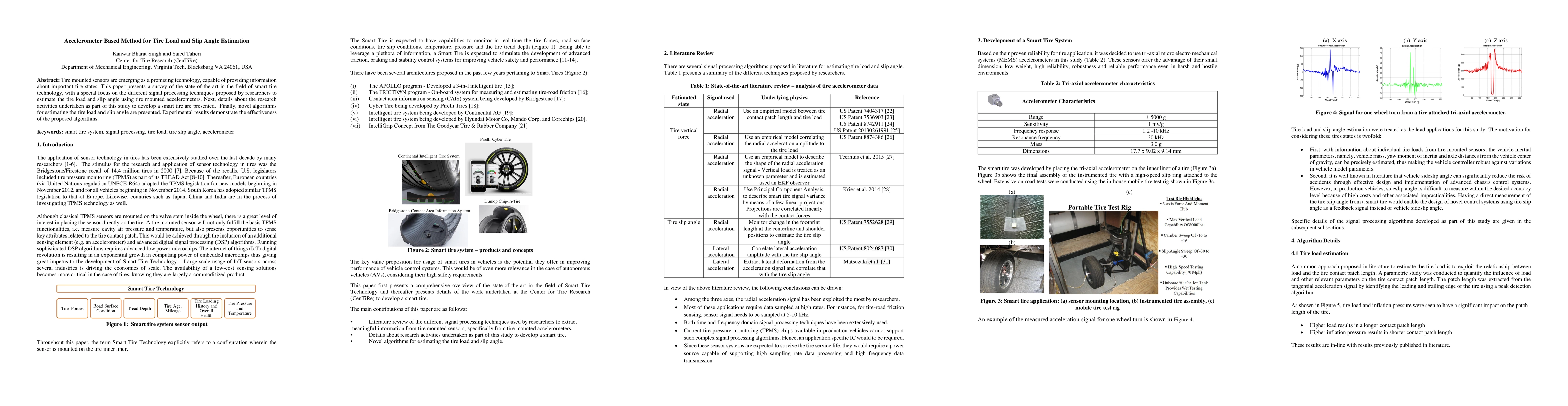Tire mounted sensors are emerging as a promising technology, capable of providing information about important tire states. This paper presents a survey of the state-of-the-art in the field of smart tire technology, with a special focus on the different signal processing techniques proposed by researchers to estimate the tire load and slip angle using tire mounted accelerometers. Next, details about the research activities undertaken as part of this study to develop a smart tire are presented. Finally, novel algorithms for estimating the tire load and slip angle are presented. Experimental results demonstrate the effectiveness of the proposed algorithms.