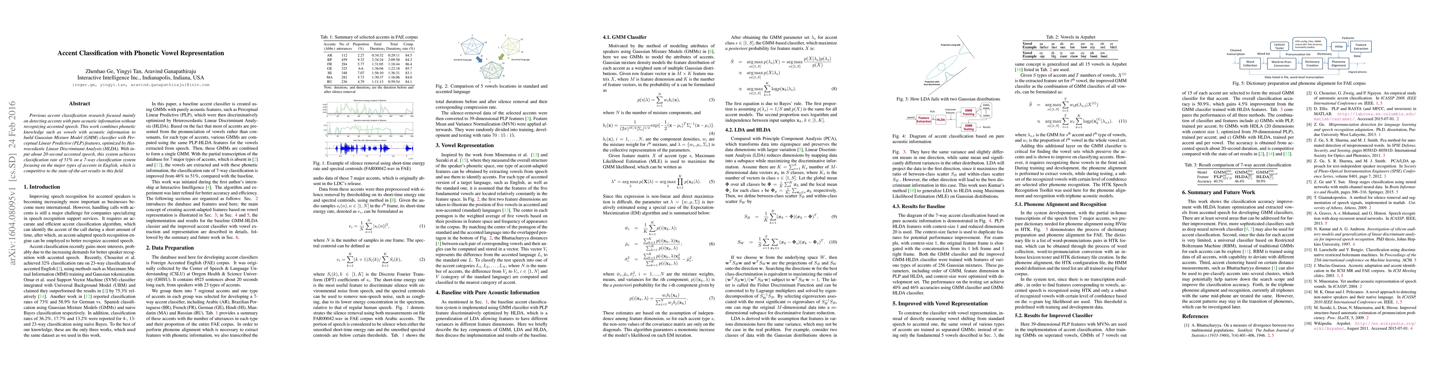 Previous accent classification research focused mainly on detecting accents with pure acoustic information without recognizing accented speech. This work combines phonetic knowledge such as vowels with acoustic information to build Guassian Mixture Model (GMM) classifier with Perceptual Linear Predictive (PLP) features, optimized by Hetroscedastic Linear Discriminant Analysis (HLDA). With input about 20-second accented speech, this system achieves classification rate of 51% on a 7-way classification system focusing on the major types of accents in English, which is competitive to the state-of-the-art results in this field.