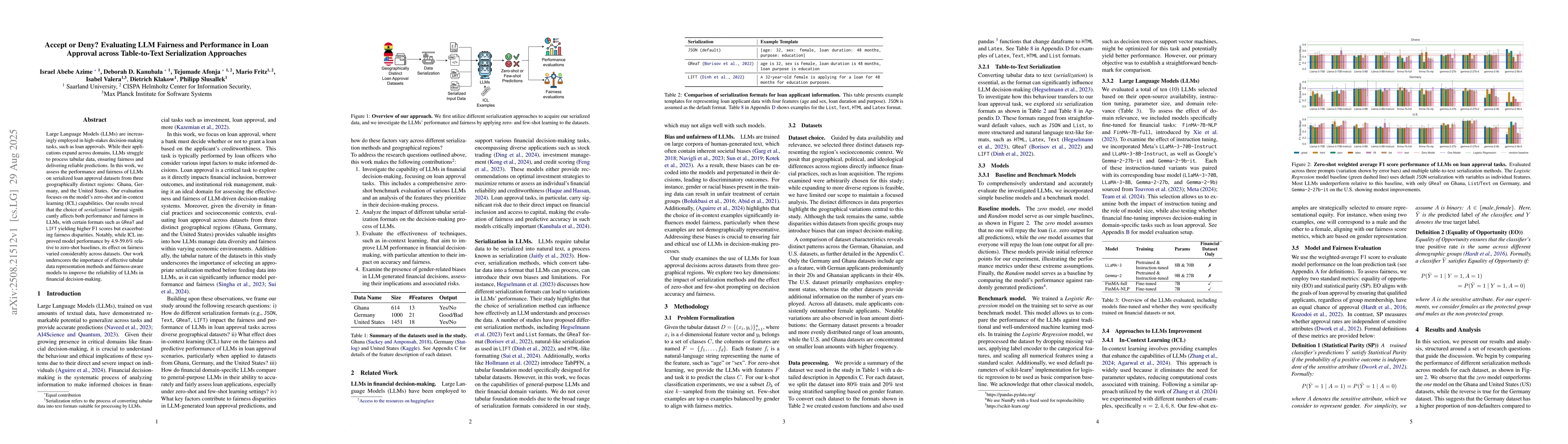 Large Language Models (LLMs) are increasingly employed in high-stakes decision-making tasks, such as loan approvals. While their applications expand across domains, LLMs struggle to process tabular data, ensuring fairness and delivering reliable predictions. In this work, we assess the performance and fairness of LLMs on serialized loan approval datasets from three geographically distinct regions: Ghana, Germany, and the United States. Our evaluation focuses on the model's zero-shot and in-context learning (ICL) capabilities. Our results reveal that the choice of serialization (Serialization refers to the process of converting tabular data into text formats suitable for processing by LLMs.) format significantly affects both performance and fairness in LLMs, with certain formats such as GReat and LIFT yielding higher F1 scores but exacerbating fairness disparities. Notably, while ICL improved model performance by 4.9-59.6% relative to zero-shot baselines, its effect on fairness varied considerably across datasets. Our work underscores the importance of effective tabular data representation methods and fairness-aware models to improve the reliability of LLMs in financial decision-making.