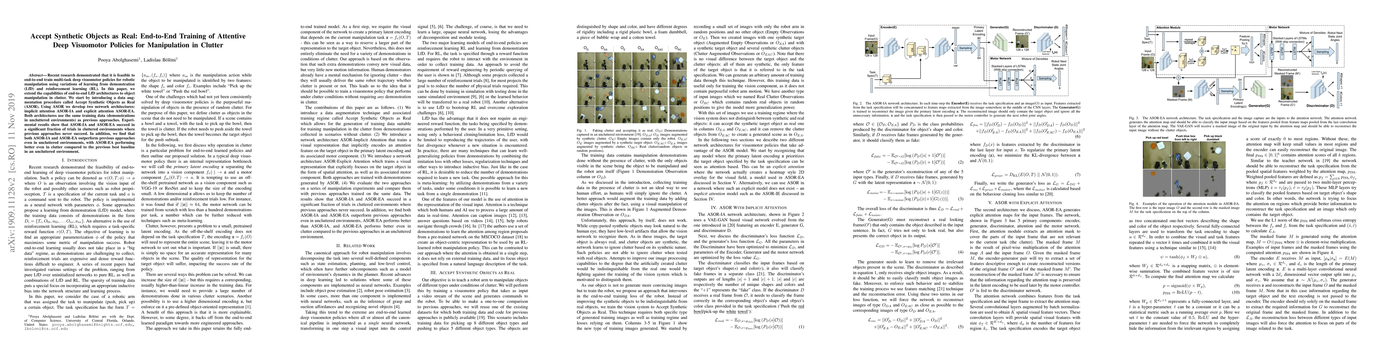 Recent research demonstrated that it is feasible to end-to-end train multi-task deep visuomotor policies for robotic manipulation using variations of learning from demonstration (LfD) and reinforcement learning (RL). In this paper, we extend the capabilities of end-to-end LfD architectures to object manipulation in clutter. We start by introducing a data augmentation procedure called Accept Synthetic Objects as Real (ASOR). Using ASOR we develop two network architectures: implicit attention ASOR-IA and explicit attention ASOR-EA. Both architectures use the same training data (demonstrations in uncluttered environments) as previous approaches. Experimental results show that ASOR-IA and ASOR-EA succeed ina significant fraction of trials in cluttered environments where previous approaches never succeed. In addition, we find that both ASOR-IA and ASOR-EA outperform previous approaches even in uncluttered environments, with ASOR-EA performing better even in clutter compared to the previous best baseline in an uncluttered environment.