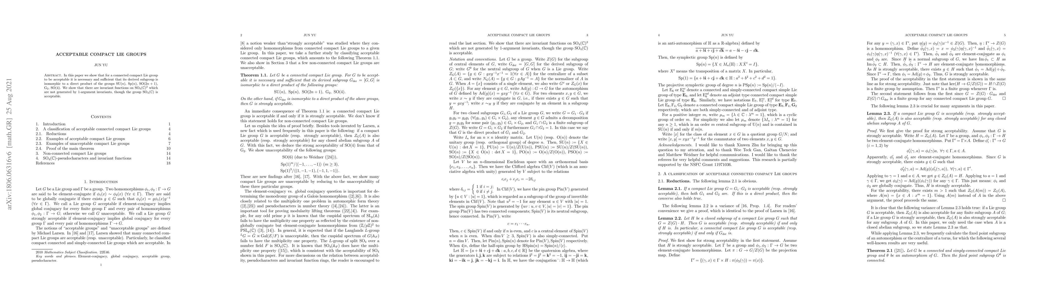 A connected compact Lie group is acceptable if its derived subgroup is a direct product of specific groups, including SU(n), Sp(n), SO(2n+1), G2, and SO(4). The paper also explores the existence of invariant functions on certain groups that cannot be generated by 1-argument invariants.