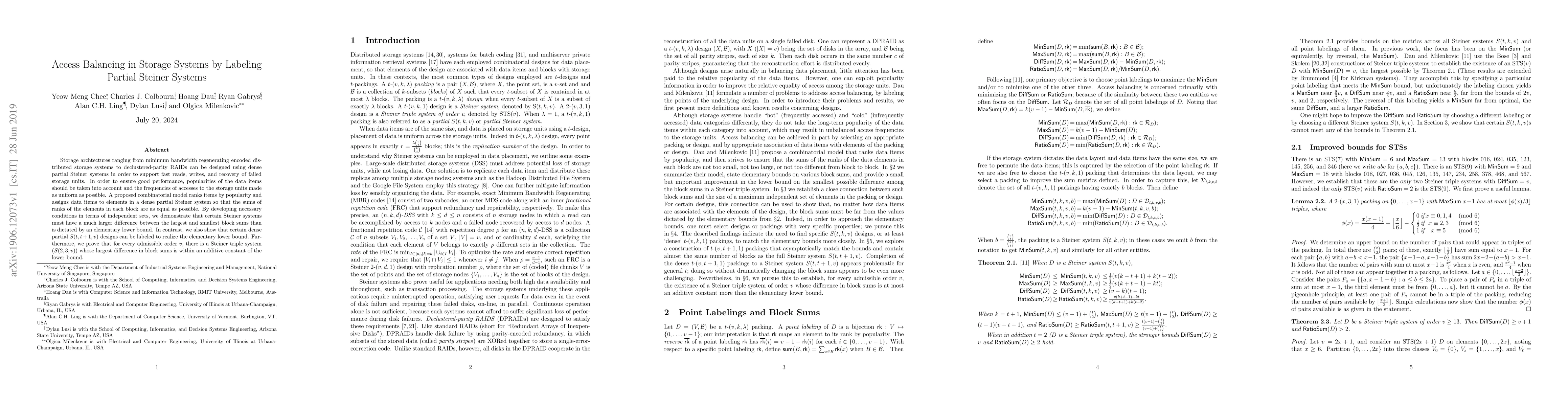 Storage architectures ranging from minimum bandwidth regenerating encoded distributed storage systems to declustered-parity RAIDs can be designed using dense partial Steiner systems in order to support fast reads, writes, and recovery of failed storage units. In order to ensure good performance, popularities of the data items should be taken into account and the frequencies of accesses to the storage units made as uniform as possible. A proposed combinatorial model ranks items by popularity and assigns data items to elements in a dense partial Steiner system so that the sums of ranks of the elements in each block are as equal as possible. By developing necessary conditions in terms of independent sets, we demonstrate that certain Steiner systems must have a much larger difference between the largest and smallest block sums than is dictated by an elementary lower bound. In contrast, we also show that certain dense partial $S(t, t+1, v)$ designs can be labeled to realize the elementary lower bound. Furthermore, we prove that for every admissible order $v$, there is a Steiner triple system $(S(2, 3, v))$ whose largest difference in block sums is within an additive constant of the lower bound.