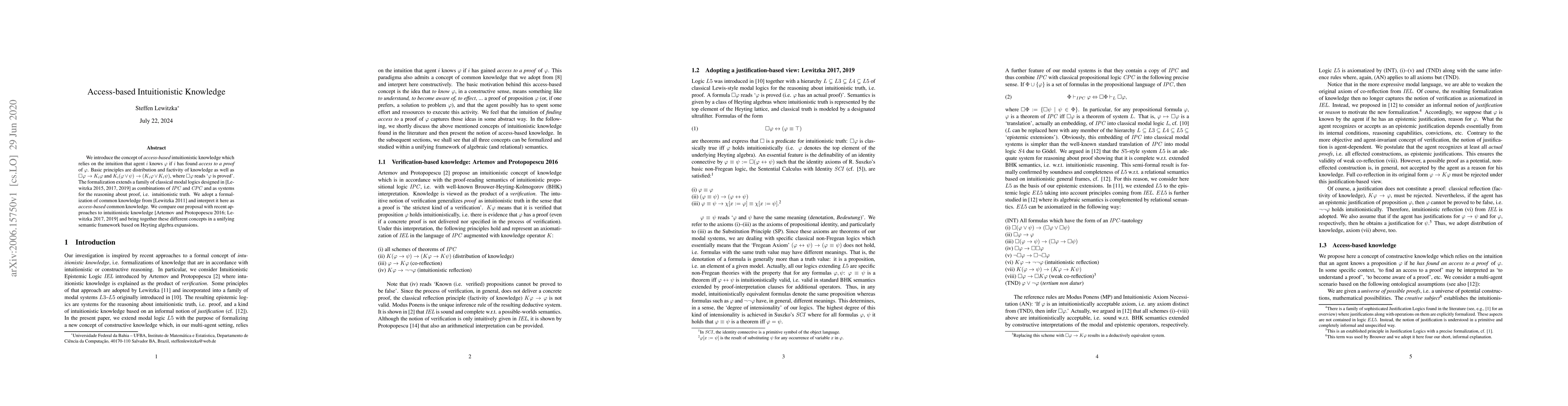 This paper introduces access-based intuitionistic knowledge, where agent $i$ knows $\varphi$ if they have access to a proof of $\varphi$. It formalizes this concept using intuitionistic logic and compares it with recent approaches, integrating it into a unifying semantic framework based on Heyting algebra expansions.