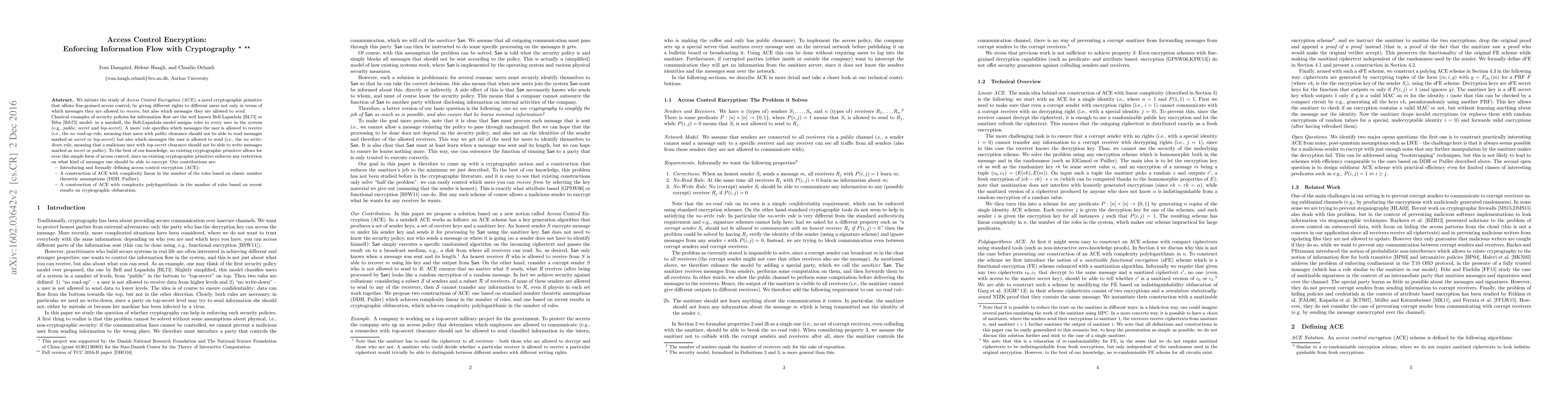 We initiate the study of Access Control Encryption (ACE), a novel cryptographic primitive that allows fine-grained access control, by giving different rights to different users not only in terms of which messages they are allowed to receive, but also which messages they are allowed to send. Classical examples of security policies for information flow are the well known Bell-Lapadula [BL73] or Biba [Bib75] model: in a nutshell, the Bell-Lapadula model assigns roles to every user in the system (e.g., public, secret and top-secret). A users' role specifies which messages the user is allowed to receive (i.e., the no read-up rule, meaning that users with public clearance should not be able to read messages marked as secret or top-secret) but also which messages the user is allowed to send (i.e., the no write-down rule, meaning that a user with top-secret clearance should not be able to write messages marked as secret or public). To the best of our knowledge, no existing cryptographic primitive allows for even this simple form of access control, since no existing cryptographic primitive enforces any restriction on what kind of messages one should be able to encrypt. Our contributions are: - Introducing and formally defining access control encryption (ACE); - A construction of ACE with complexity linear in the number of the roles based on classic number theoretic assumptions (DDH, Paillier); - A construction of ACE with complexity polylogarithmic in the number of roles based on recent results on cryptographic obfuscation;