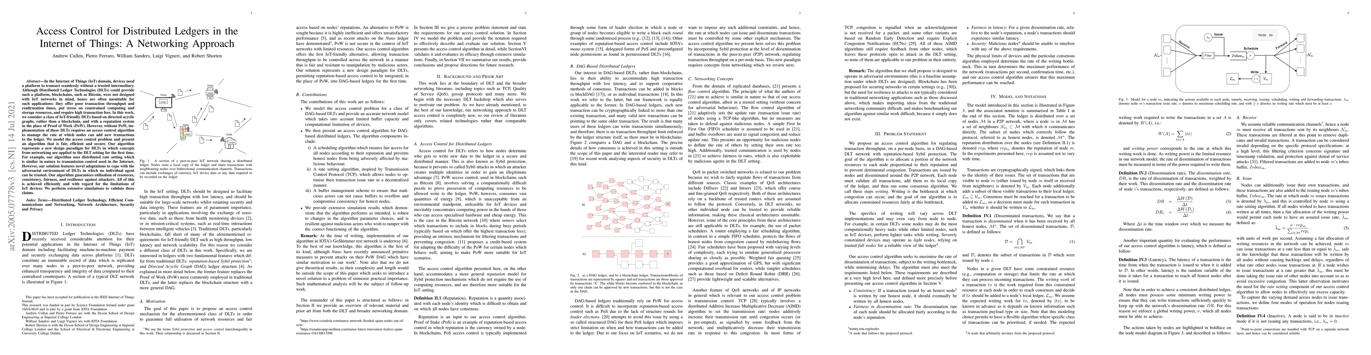 In the Internet of Things (IoT) domain, devices need a platform to transact seamlessly without a trusted intermediary. Although Distributed Ledger Technologies (DLTs) could provide such a platform, blockchains, such as Bitcoin, were not designed with IoT networks in mind, hence are often unsuitable for such applications: they offer poor transaction throughput and confirmation times, put stress on constrained computing and storage resources, and require high transaction fees. In this work, we consider a class of IoT-friendly DLTs based on directed acyclic graphs, rather than a blockchain, and with a reputation system in the place of Proof of Work (PoW). However, without PoW, implementation of these DLTs requires an access control algorithm to manage the rate at which nodes can add new transactions to the ledger. We model the access control problem and present an algorithm that is fair, efficient and secure. Our algorithm represents a new design paradigm for DLTs in which concepts from networking are applied to the DLT setting for the first time. For example, our algorithm uses distributed rate setting which is similar in nature to transmission control used in the Internet. However, our solution features novel adaptations to cope with the adversarial environment of DLTs in which no individual agent can be trusted. Our algorithm guarantees utilisation of resources, consistency, fairness, and resilience against attackers. All of this is achieved efficiently and with regard for the limitations of IoT devices. We perform extensive simulations to validate these claims.