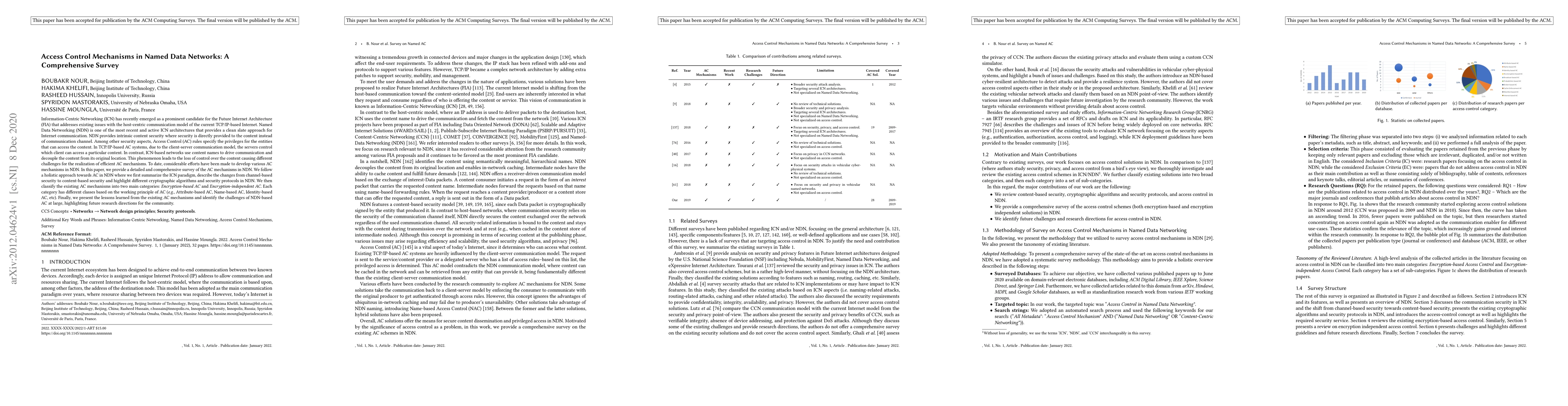 This paper provides a comprehensive survey of access control mechanisms in Named Data Networking (NDN), detailing the shift from channel-based to content-based security in Information-Centric Networking (ICN). It classifies existing AC mechanisms into encryption-based and encryption-independent categories, and identifies challenges and future research directions for NDN-based access control.