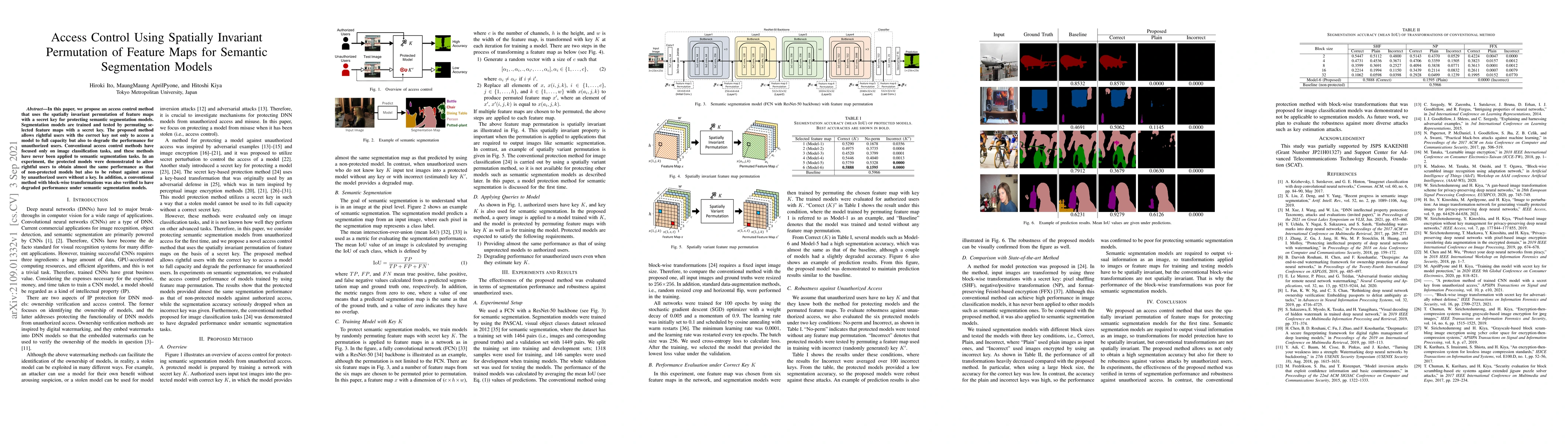 This paper introduces an access control technique for semantic segmentation models using spatially invariant permutation of feature maps with a secret key, enabling rightful users to access the model fully while degrading performance for unauthorized users. Experimental results show that protected models maintain performance for authorized users while being robust against unauthorized access.