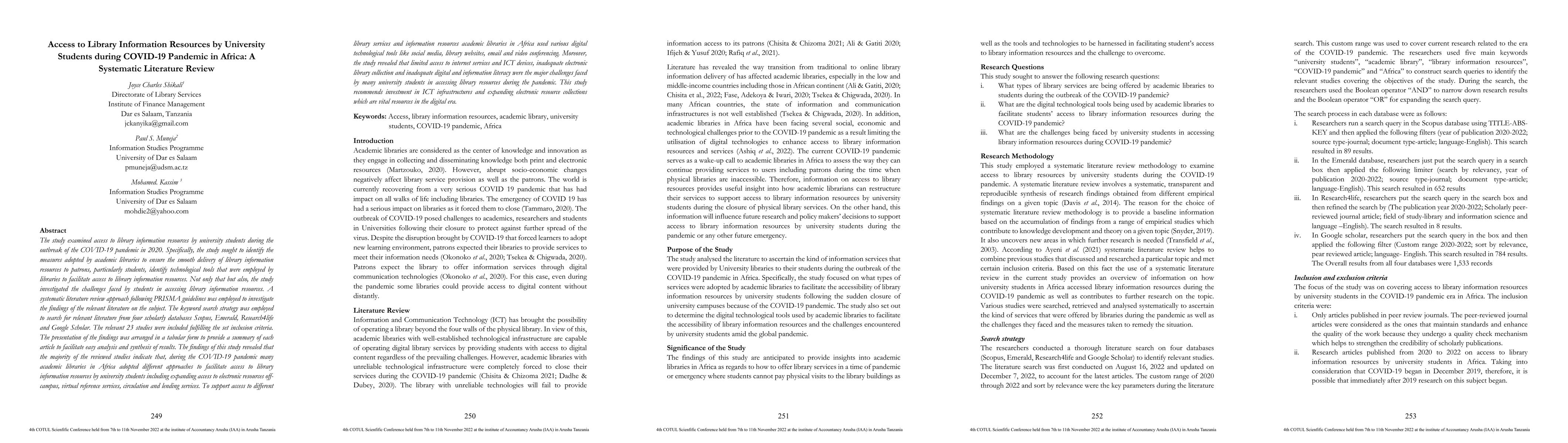 The study examined access to library information resources by university students during the outbreak of the COVID-19 pandemic. The study investigated measures that were adopted by academic libraries for smooth delivery of library information resources to their patrons. It also identified technological tools that were employed by libraries to facilitate access to library information resources. We also investigated the challenges faced by students in accessing library information resources. A systematic literature review approach using PRISMA guidelines was employed to investigate the relevant literature on the subject. The keyword search strategy was employed to search for relevant literature from four scholarly databases Scopus, emerald, Research4life, and Google Scholar. In this study, 23 studies that fulfilled the criteria were included. The findings revealed that the majority of the reviewed studies indicate that, during the COVID-19 pandemic many academic libraries in Africa adopted different approaches to facilitate access to library information resources by university students including expanding access to electronic resources off-campus, virtual reference services, circulation and lending services. To support access to different library services and information resources academic libraries in Africa used various digital technological tools like social media, library websites, email and video conferencing. Moreover, the study revealed that limited access to internet services and ICT devices, inadequate electronic library collection and inadequate digital and information literacy were the major challenges faced by patrons during the pandemic. This study recommends investment in ICT infrastructures and expanding electronic resource collections which are vital resources in the digital era.