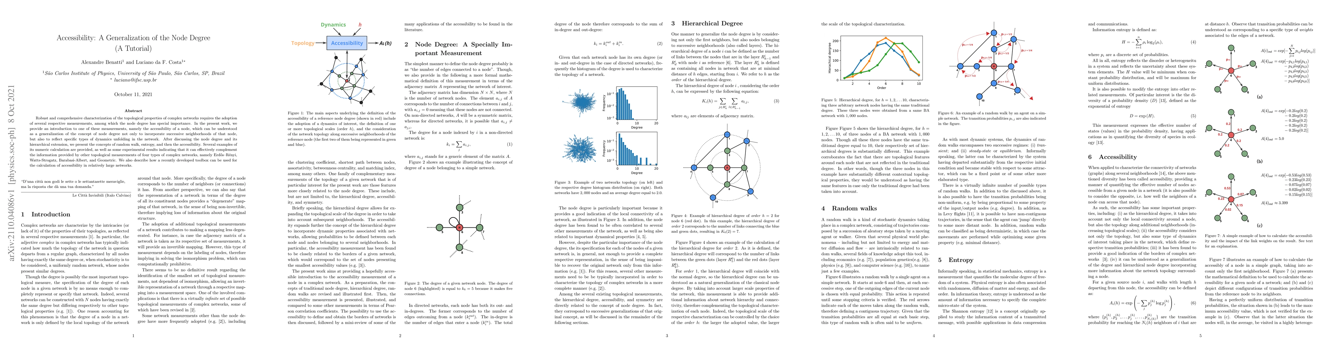 Robust and comprehensive characterization of the topological properties of complex networks requires the adoption of several respective measurements, among which the node degree has special importance. In the present work, we provide an introduction to one of these measurements, namely the accessibility of a node, which can be understood as a generalization of the concept of node degree not only to incorporate successive neighborhoods of that node, but also to reflect specific types of dynamics unfolding in the network. After discussing the node degree and its hierarchical extension, we present the concepts of random walk, entropy, and then the accessibility. Several examples of its numeric calculation are provided, as well as some experimental results indicating that it can effectively complement the information provided by other topological measurements of four types of complex networks, namely Erdos-Renyi, Watts-Strogatz, Barabasi-Albert, and Geometric. We also describe how a recently developed toolbox can be used for the calculation of accessibility in relatively large networks.