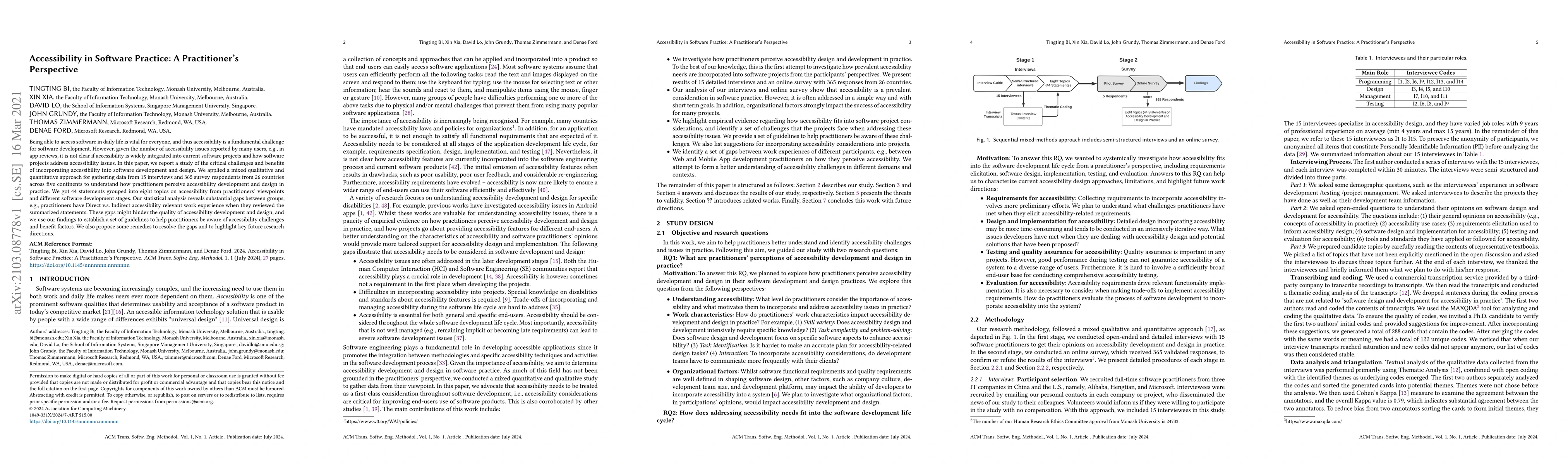 This study investigates the integration of accessibility in software development through a mixed-method approach involving interviews and surveys from 51 practitioners worldwide. It identifies significant gaps in accessibility experience and proposes guidelines and remedies to address these challenges, aiming to improve accessibility in software projects.