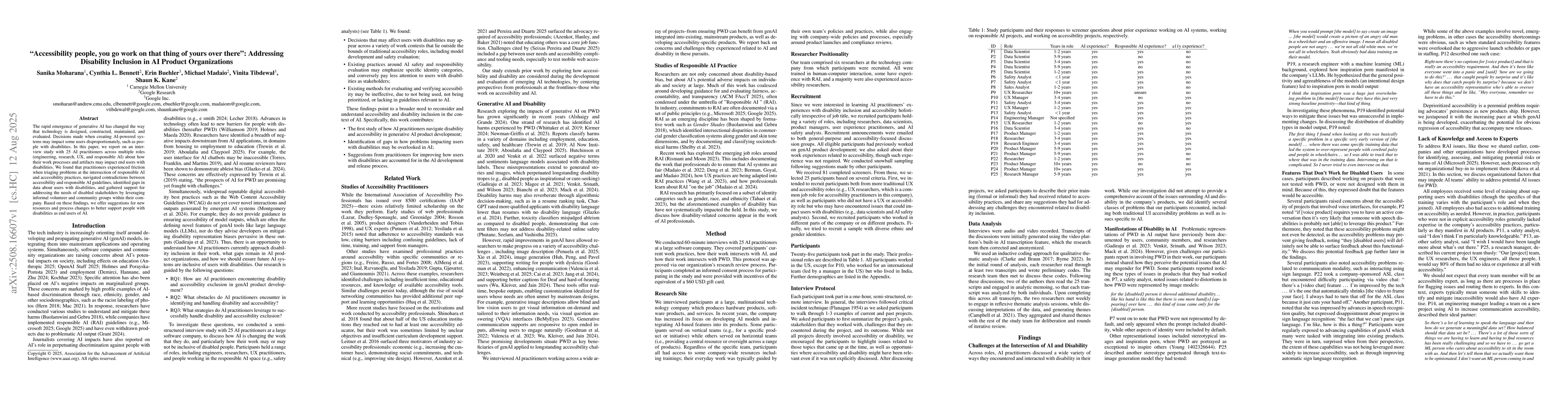 The rapid emergence of generative AI has changed the way that technology is designed, constructed, maintained, and evaluated. Decisions made when creating AI-powered systems may impact some users disproportionately, such as people with disabilities. In this paper, we report on an interview study with 25 AI practitioners across multiple roles (engineering, research, UX, and responsible AI) about how their work processes and artifacts may impact end users with disabilities. We found that practitioners experienced friction when triaging problems at the intersection of responsible AI and accessibility practices, navigated contradictions between accessibility and responsible AI guidelines, identified gaps in data about users with disabilities, and gathered support for addressing the needs of disabled stakeholders by leveraging informal volunteer and community groups within their company. Based on these findings, we offer suggestions for new resources and process changes to better support people with disabilities as end users of AI.