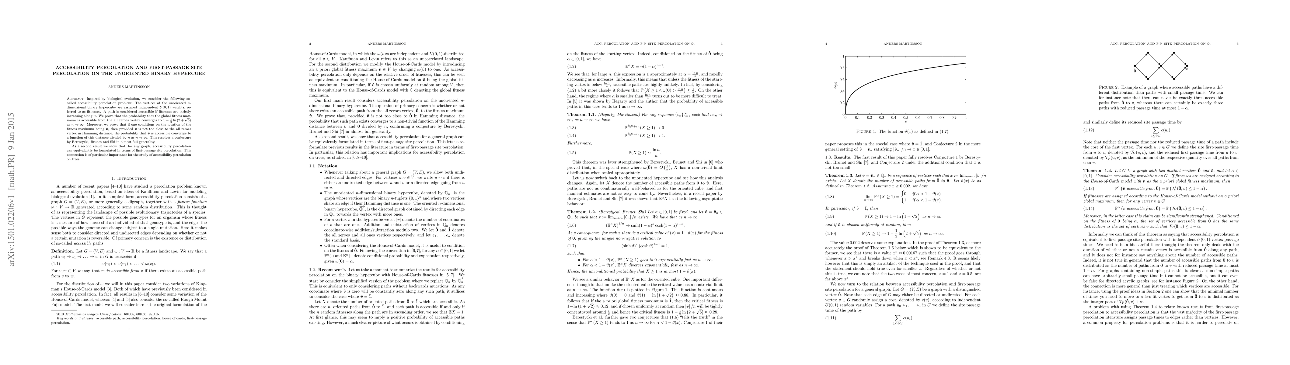 This paper studies accessibility percolation on the unoriented binary hypercube, where vertices have independent fitness weights. It proves the probability of global fitness maximum accessibility converges to a specific limit as dimension increases. Additionally, it establishes a connection between accessibility percolation and first-passage site percolation, which is significant for analyzing such problems on trees.