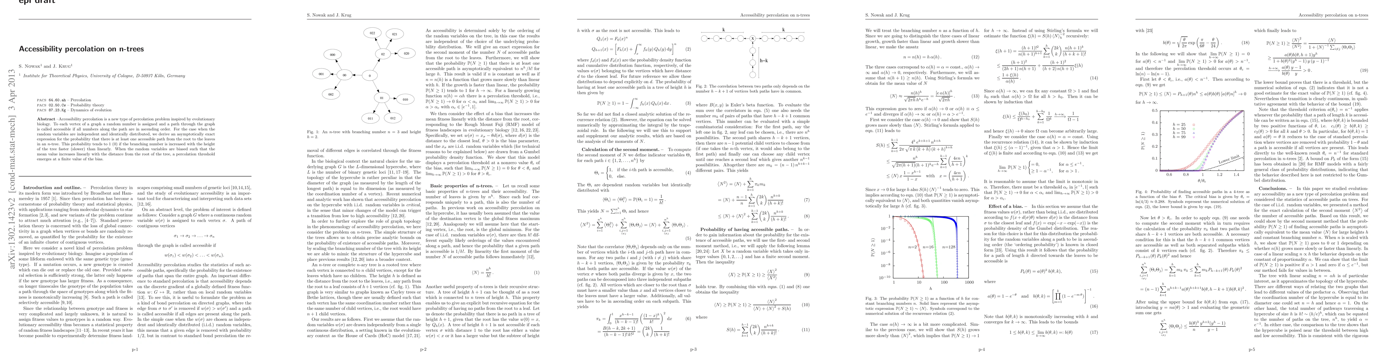 Accessibility percolation is a new type of percolation problem inspired by evolutionary biology. To each vertex of a graph a random number is assigned and a path through the graph is called accessible if all numbers along the path are in ascending order. For the case when the random variables are independent and identically distributed, we derive an asymptotically exact expression for the probability that there is at least one accessible path from the root to the leaves in an $n$-tree. This probability tends to 1 (0) if the branching number is increased with the height of the tree faster (slower) than linearly. When the random variables are biased such that the mean value increases linearly with the distance from the root, a percolation threshold emerges at a finite value of the bias.