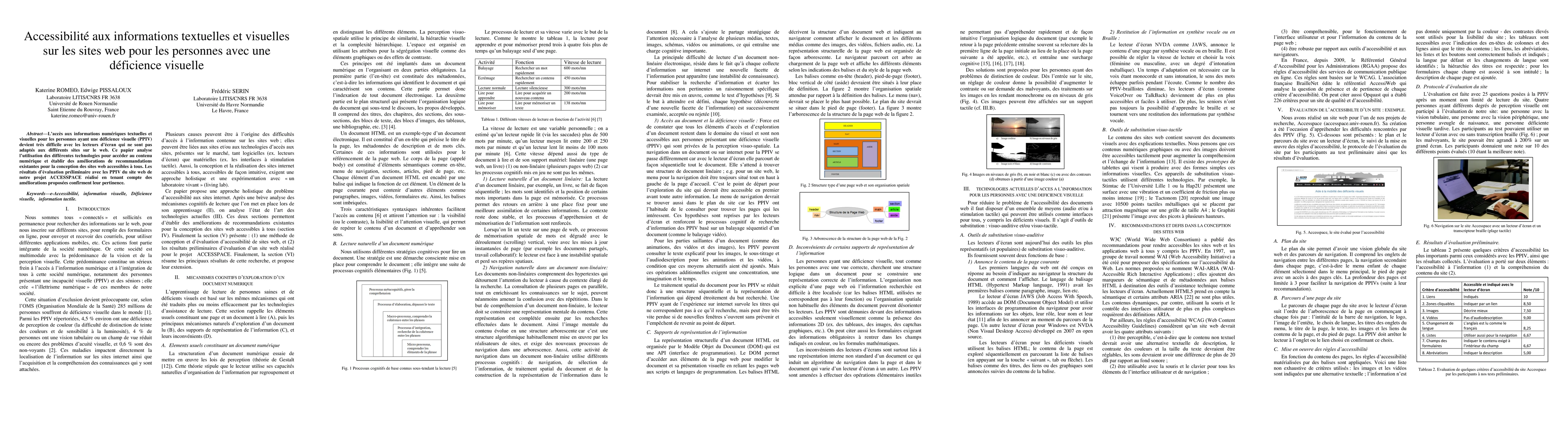 Access to textual and visual information for visually impaired persons becomes very difficult with screen readers which are not adapted to different websites.This paper analyses the use of different technologies for access digital content and to establish some ameliorations to the existing recommendations to accessible website conception for all. The preliminary evaluation results with visually impaired people of our website ACCESSPACE which is constructed with the existing recommendations, confirm the project's relevance.
