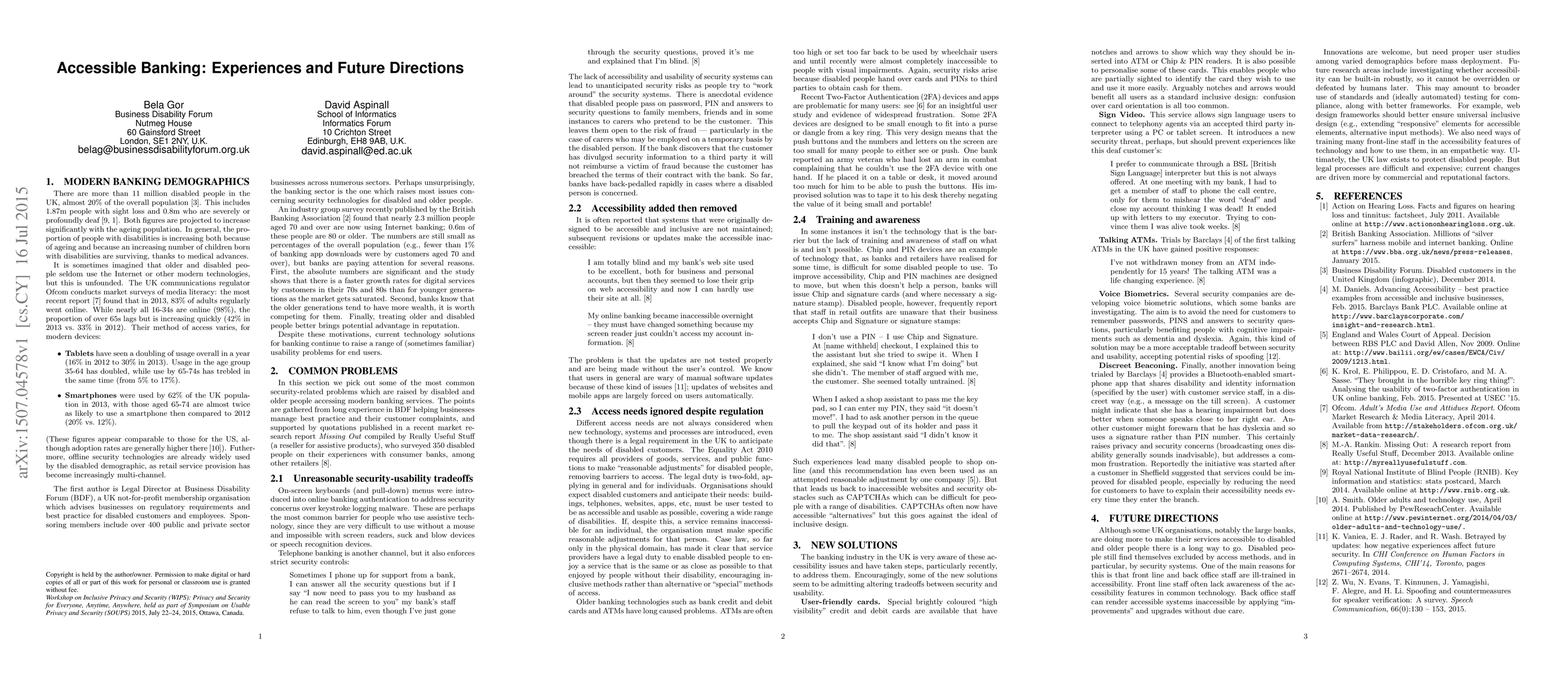This is a short position paper drawing on experience working with the UK banking industry and their disabled and ageing customers in the Business Disability Forum, a UK non-profit member organisation funded by a large body of UK private and public sector businesses. We describe some commonly reported problems of disabled customers who use modern banking technologies, relating them to UK law and best practice. We describe some of the recent banking industry innovations and the hope they may offer for improved inclusive and accessible multi-channel banking.