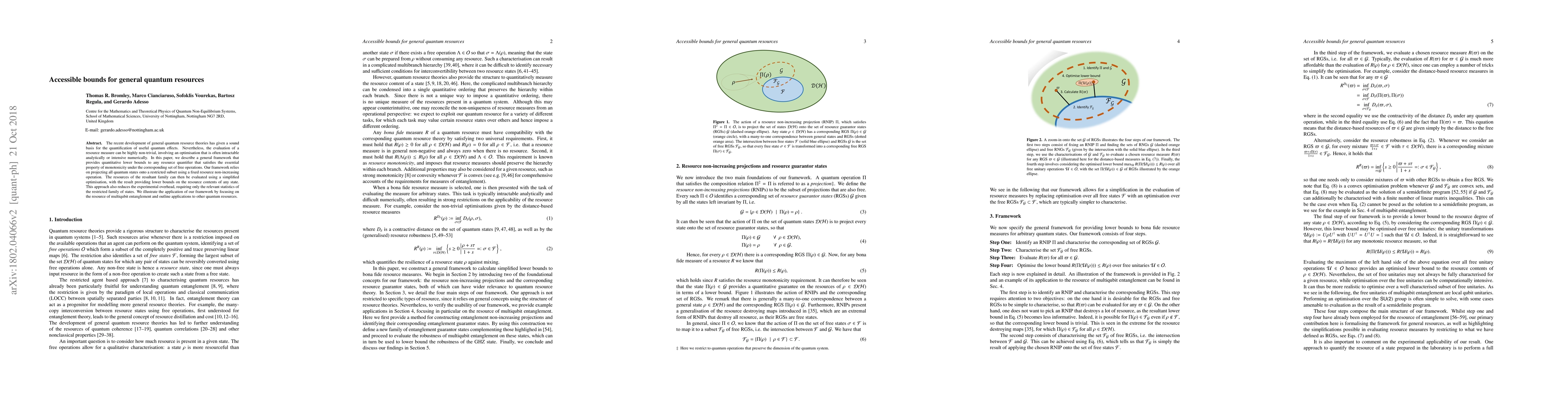 The recent development of general quantum resource theories has given a sound basis for the quantification of useful quantum effects. Nevertheless, the evaluation of a resource measure can be highly non-trivial, involving an optimisation that is often intractable analytically or intensive numerically. In this paper, we describe a general framework that provides quantitative lower bounds to any resource quantifier that satisfies the essential property of monotonicity under the corresponding set of free operations. Our framework relies on projecting all quantum states onto a restricted subset using a fixed resource non-increasing operation. The resources of the resultant family can then be evaluated using a simplified optimisation, with the result providing lower bounds on the resource contents of any state. This approach also reduces the experimental overhead, requiring only the relevant statistics of the restricted family of states. We illustrate the application of our framework by focusing on the resource of multiqubit entanglement and outline applications to other quantum resources.