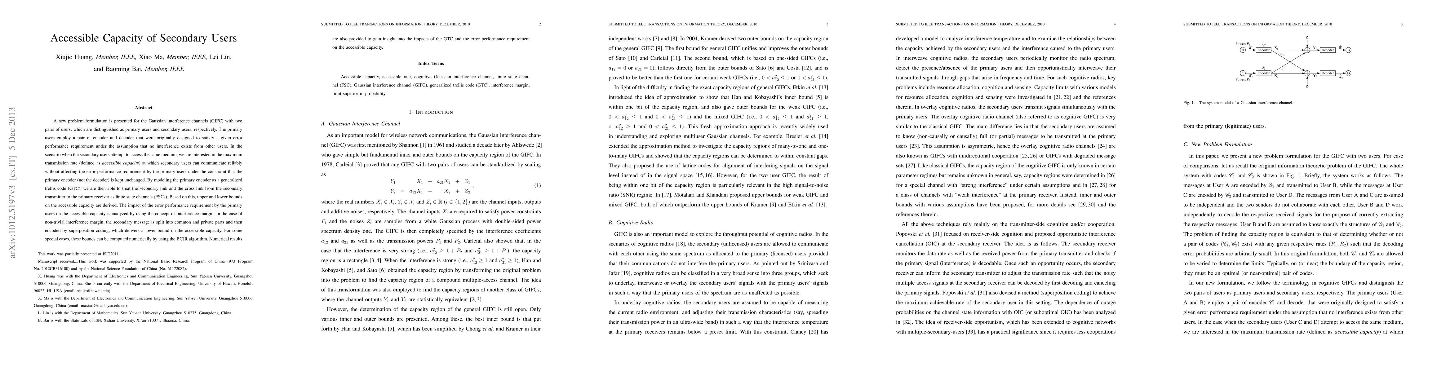 A new problem formulation is presented for the Gaussian interference channels (GIFC) with two pairs of users, which are distinguished as primary users and secondary users, respectively. The primary users employ a pair of encoder and decoder that were originally designed to satisfy a given error performance requirement under the assumption that no interference exists from other users. In the scenario when the secondary users attempt to access the same medium, we are interested in the maximum transmission rate (defined as {\em accessible capacity}) at which secondary users can communicate reliably without affecting the error performance requirement by the primary users under the constraint that the primary encoder (not the decoder) is kept unchanged. By modeling the primary encoder as a generalized trellis code (GTC), we are then able to treat the secondary link and the cross link from the secondary transmitter to the primary receiver as finite state channels (FSCs). Based on this, upper and lower bounds on the accessible capacity are derived. The impact of the error performance requirement by the primary users on the accessible capacity is analyzed by using the concept of interference margin. In the case of non-trivial interference margin, the secondary message is split into common and private parts and then encoded by superposition coding, which delivers a lower bound on the accessible capacity. For some special cases, these bounds can be computed numerically by using the BCJR algorithm. Numerical results are also provided to gain insight into the impacts of the GTC and the error performance requirement on the accessible capacity.