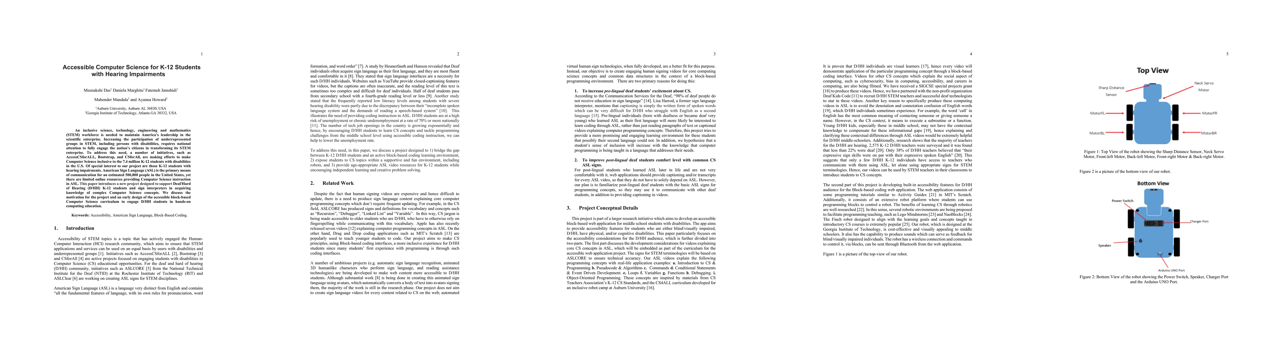 An inclusive science, technology, engineering and mathematics (STEM) workforce is needed to maintain America's leadership in the scientific enterprise. Increasing the participation of underrepresented groups in STEM, including persons with disabilities, requires national attention to fully engage the nation's citizens in transforming its STEM enterprise. To address this need, a number of initiatives, such as AccessCSforALL, Bootstrap, and CSforAll, are making efforts to make Computer Science inclusive to the 7.4 million K-12 students with disabilities in the U.S. Of special interest to our project are those K-12 students with hearing impairments. American Sign Language (ASL) is the primary means of communication for an estimated 500,000 people in the United States, yet there are limited online resources providing Computer Science instruction in ASL. This paper introduces a new project designed to support Deaf and Hard of Hearing (DHH) K-12 students and sign interpreters in acquiring knowledge of complex Computer Science concepts. We discuss the motivation for the project and an early design of the accessible block-based Computer Science curriculum to engage DHH students in hands-on computing education.
