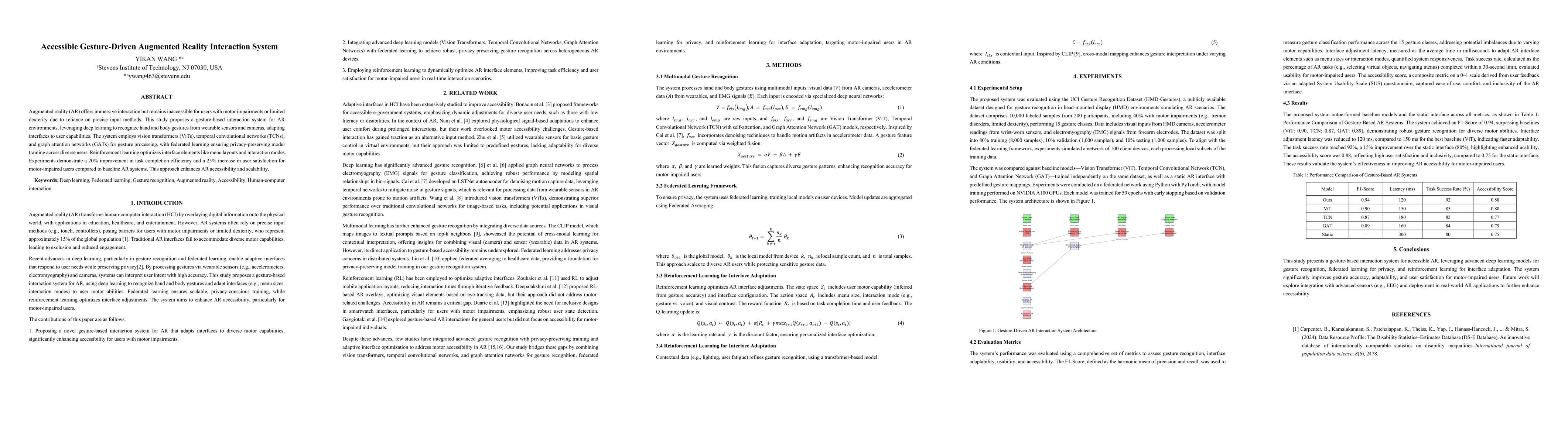 Augmented reality (AR) offers immersive interaction but remains inaccessible for users with motor impairments or limited dexterity due to reliance on precise input methods. This study proposes a gesture-based interaction system for AR environments, leveraging deep learning to recognize hand and body gestures from wearable sensors and cameras, adapting interfaces to user capabilities. The system employs vision transformers (ViTs), temporal convolutional networks (TCNs), and graph attention networks (GATs) for gesture processing, with federated learning ensuring privacy-preserving model training across diverse users. Reinforcement learning optimizes interface elements like menu layouts and interaction modes. Experiments demonstrate a 20% improvement in task completion efficiency and a 25% increase in user satisfaction for motor-impaired users compared to baseline AR systems. This approach enhances AR accessibility and scalability. Keywords: Deep learning, Federated learning, Gesture recognition, Augmented reality, Accessibility, Human-computer interaction