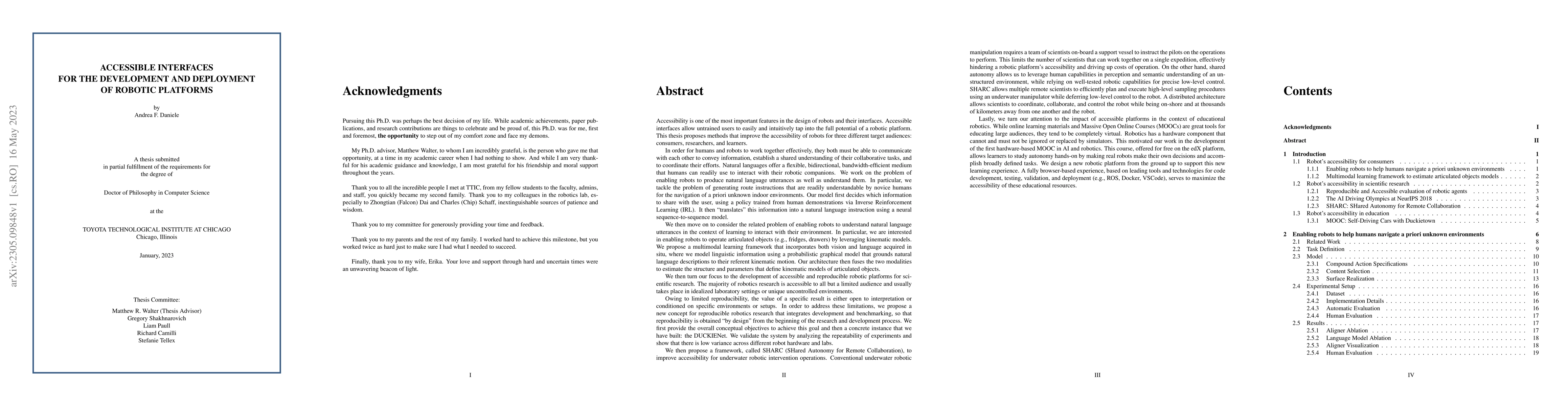 Accessibility is one of the most important features in the design of robots and their interfaces. This thesis proposes methods that improve the accessibility of robots for three different target audiences: consumers, researchers, and learners. In order for humans and robots to work together effectively, they both must be able to communicate with each other. We tackle the problem of generating route instructions that are readily understandable by novice humans for the navigation of a priori unknown indoor environments. We then move on to the related problem of enabling robots to understand natural language utterances in the context of learning to operate articulated objects (e.g., fridges, drawers) by leveraging kinematic models. Next, we turn our focus to the development of accessible and reproducible robotic platforms for scientific research. We propose a new concept for reproducible robotics research that integrates development and benchmarking, so that reproducibility is obtained "by design" from the beginning of the research and development process. We then propose a framework called SHARC (SHared Autonomy for Remote Collaboration), to improve accessibility for underwater robotic intervention operations. SHARC allows multiple remote scientists to efficiently plan and execute high-level sampling procedures using an underwater manipulator while deferring low-level control to the robot. Lastly, we developed the first hardware-based MOOC in AI and robotics. This course allows learners to study autonomy hands-on by making real robots make their own decisions and accomplish broadly defined tasks. We design a new robotic platform from the ground up to support this new learning experience. A fully browser-based interface, based on leading tools and technologies for code development, testing, validation, and deployment serves to maximize the accessibility of these educational resources.