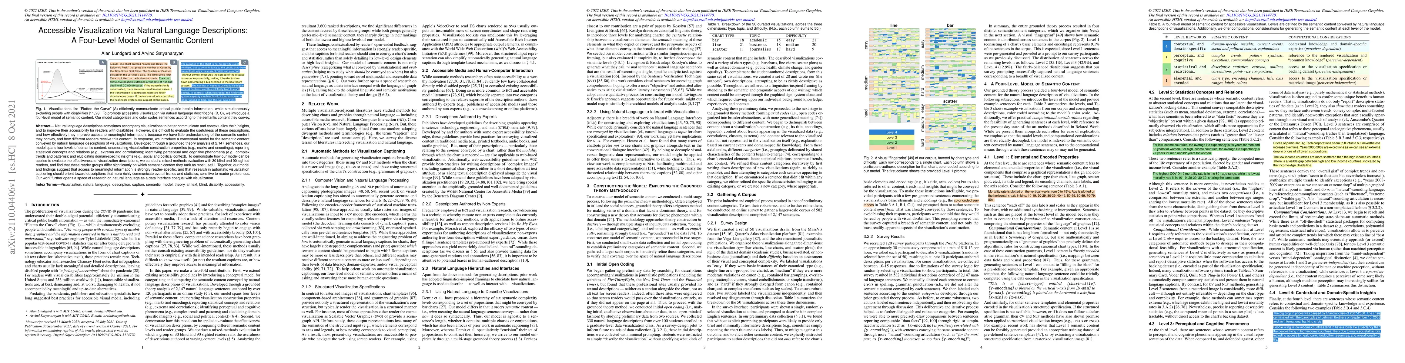 Natural language descriptions sometimes accompany visualizations to better communicate and contextualize their insights, and to improve their accessibility for readers with disabilities. However, it is difficult to evaluate the usefulness of these descriptions, and how effectively they improve access to meaningful information, because we have little understanding of the semantic content they convey, and how different readers receive this content. In response, we introduce a conceptual model for the semantic content conveyed by natural language descriptions of visualizations. Developed through a grounded theory analysis of 2,147 sentences, our model spans four levels of semantic content: enumerating visualization construction properties (e.g., marks and encodings); reporting statistical concepts and relations (e.g., extrema and correlations); identifying perceptual and cognitive phenomena (e.g., complex trends and patterns); and elucidating domain-specific insights (e.g., social and political context). To demonstrate how our model can be applied to evaluate the effectiveness of visualization descriptions, we conduct a mixed-methods evaluation with 30 blind and 90 sighted readers, and find that these reader groups differ significantly on which semantic content they rank as most useful. Together, our model and findings suggest that access to meaningful information is strongly reader-specific, and that research in automatic visualization captioning should orient toward descriptions that more richly communicate overall trends and statistics, sensitive to reader preferences. Our work further opens a space of research on natural language as a data interface coequal with visualization.