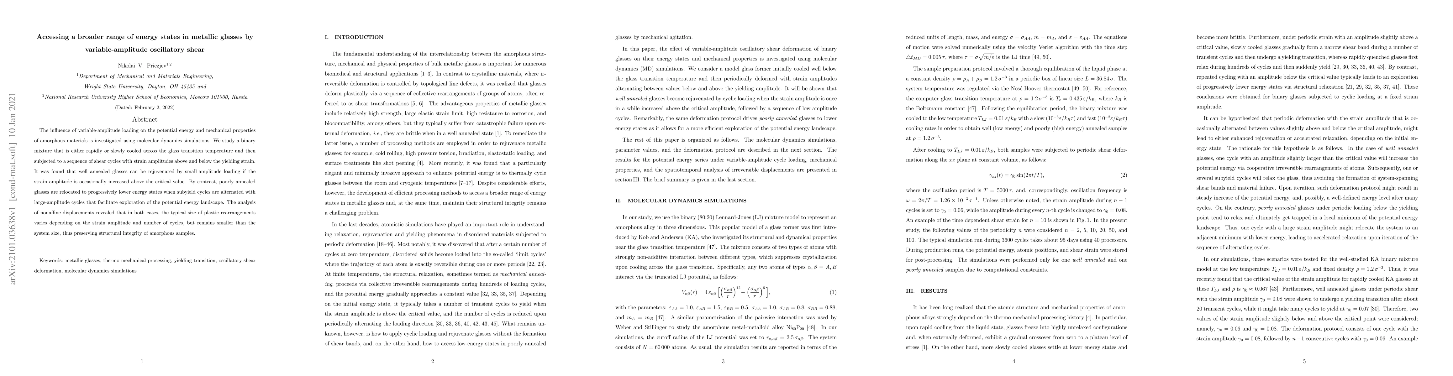 The influence of variable-amplitude loading on the potential energy and mechanical properties of amorphous materials is investigated using molecular dynamics simulations. We study a binary mixture that is either rapidly or slowly cooled across the glass transition temperature and then subjected to a sequence of shear cycles with strain amplitudes above and below the yielding strain. It was found that well annealed glasses can be rejuvenated by small-amplitude loading if the strain amplitude is occasionally increased above the critical value. By contrast, poorly annealed glasses are relocated to progressively lower energy states when subyield cycles are alternated with large-amplitude cycles that facilitate exploration of the potential energy landscape. The analysis of nonaffine displacements revealed that in both cases, the typical size of plastic rearrangements varies depending on the strain amplitude and number of cycles, but remains smaller than the system size, thus preserving structural integrity of amorphous samples.