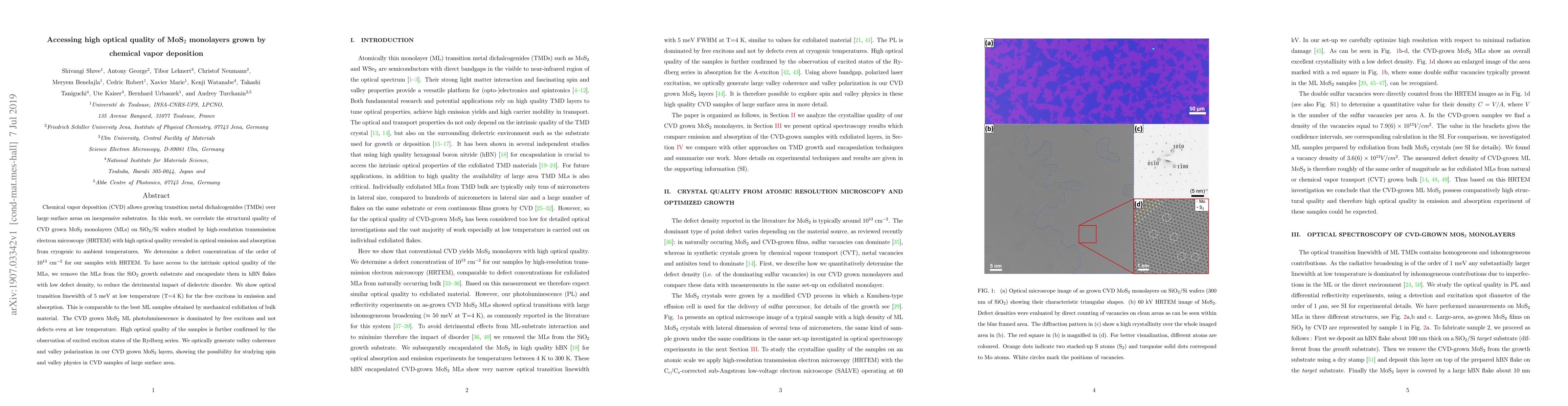 This paper investigates the optical quality of MoS$_2$ monolayers grown via chemical vapor deposition (CVD) using high-resolution transmission electron microscopy (HRTEM) and optical emission/absorption techniques. The study finds a defect concentration of 10$^{13}$ cm$^{-2}$ and demonstrates high optical quality through a linewidth of 5 meV for free excitons at cryogenic temperatures, comparable to mechanically exfoliated samples.