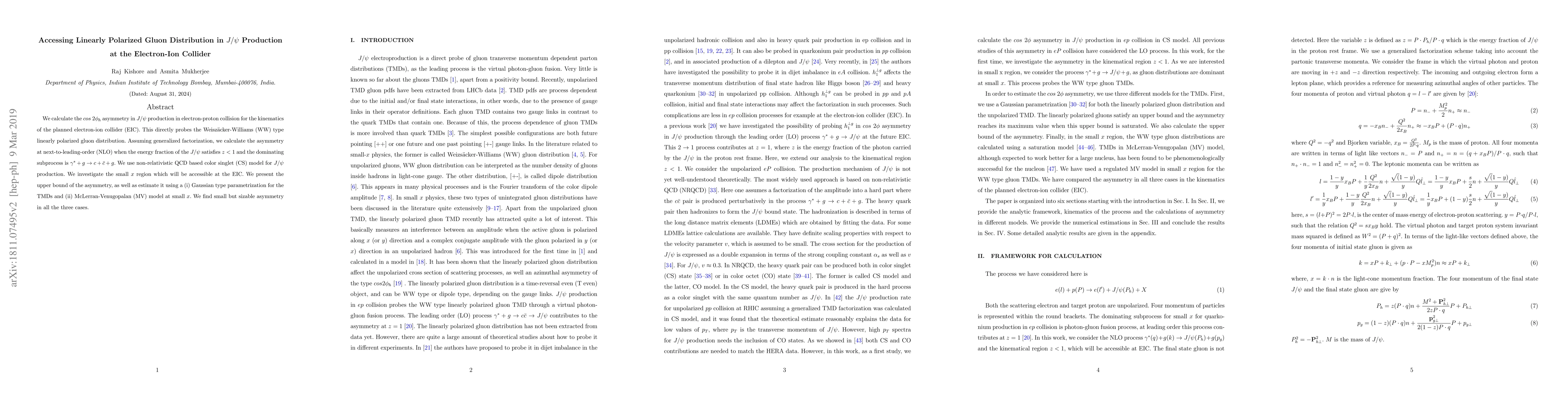 This paper calculates the $cos~2 \phi$ asymmetry in $J/\psi$ production in electron-proton collisions at the EIC, probing the linearly polarized gluon distribution. It finds a small but significant asymmetry using NLO calculations and various models for the TMDs and small $x$ region.