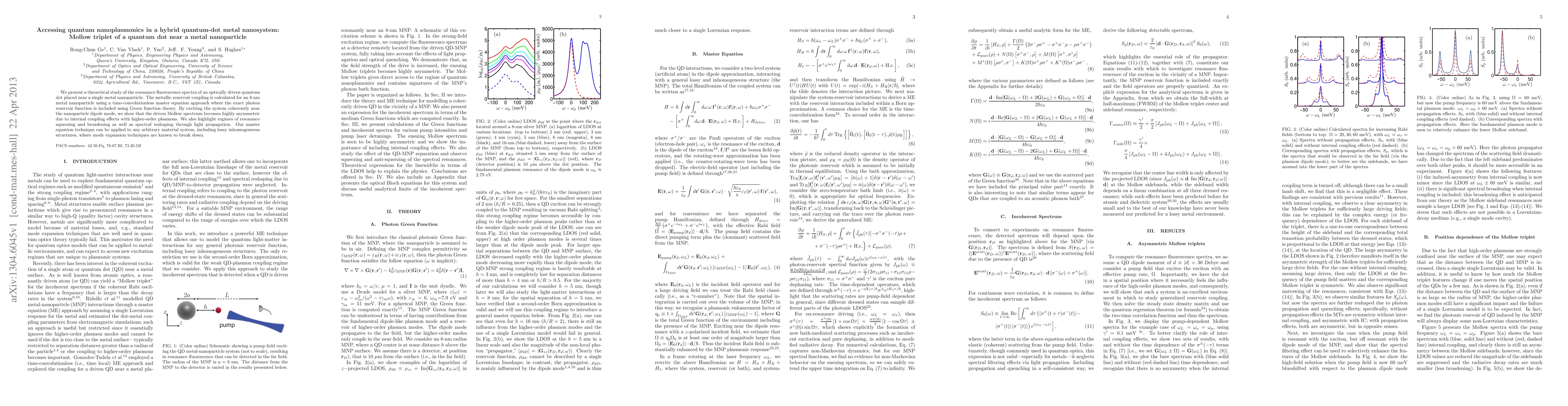 We present a theoretical study of the resonance fluorescence spectra of an optically driven quantum dot placed near a single metal nanoparticle. The metallic reservoir coupling is calculated for an 8-nm metal nanoparticle using a time-convolutionless master equation approach where the exact photon reservoir function is included using Green function theory. By exciting the system coherently near the nanoparticle dipole mode, we show that the driven Mollow spectrum becomes highly asymmetric due to internal coupling effects with higher-order plasmons. We also highlight regimes of resonance squeezing and broadening as well as spectral reshaping through light propagation. Our master equation technique can be applied to any arbitrary material system, including lossy inhomogeneous structures, where mode expansion techniques are known to break down.