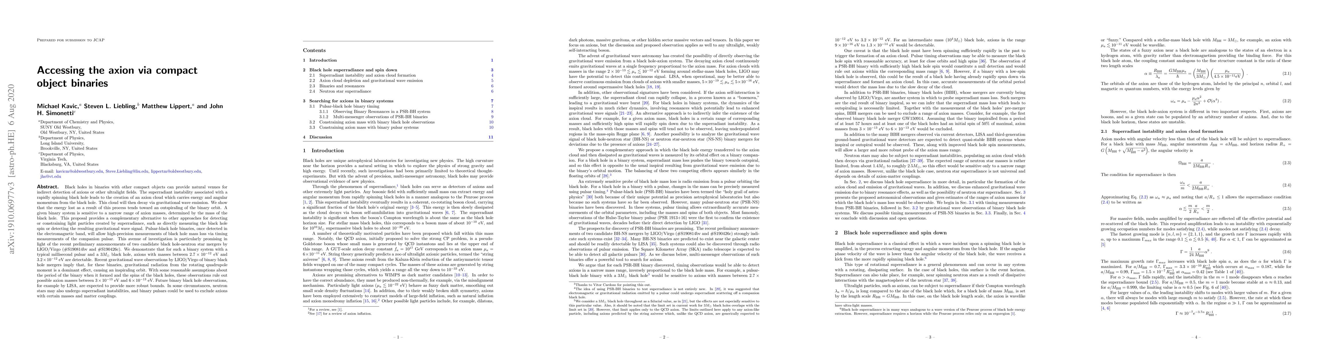 Researchers propose using compact object binaries to detect axions via superradiant instability and gravitational wave emission, with a potential detection window for masses between 2.7e-12 eV and 3.2e-12 eV.