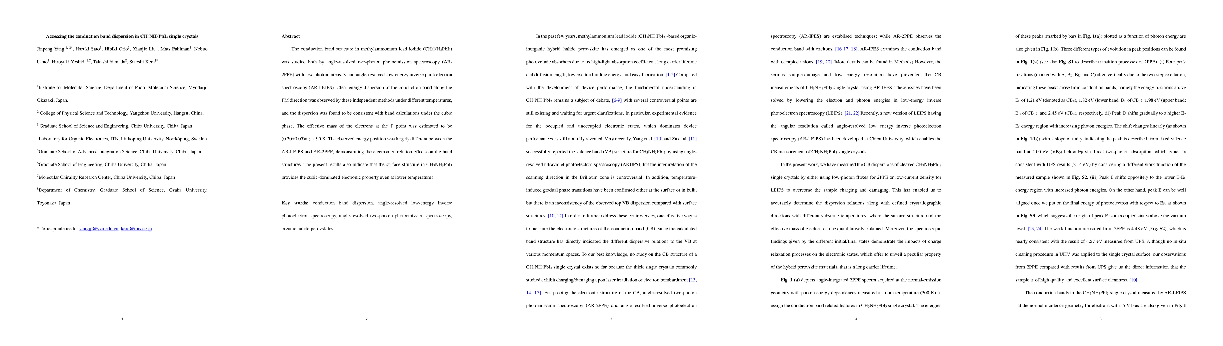 The conduction band structure in methylammonium lead iodide (CH3NH3PbI3) was studied both by angle-resolved two-photon photoemission spectroscopy (AR-2PPE) with low-photon intensity and angle-resolved low-energy inverse photoelectron spectroscopy (AR-LEIPS). Clear energy dispersion of the conduction band along the {\Gamma}M direction was observed by these independent methods under different temperatures, and the dispersion was found to be consistent with band calculations under the cubic phase. The effective mass of the electrons at the {\Gamma} point was estimated to be (0.20+-0.05)m0 at 90 K. The observed energy position was largely different between the AR-LEIPS and AR-2PPE, demonstrating the electron correlation effects on the band structures. The present results also indicate that the surface structure in CH3NH3PbI3 provides the cubic-dominated electronic property even at lower temperatures.
