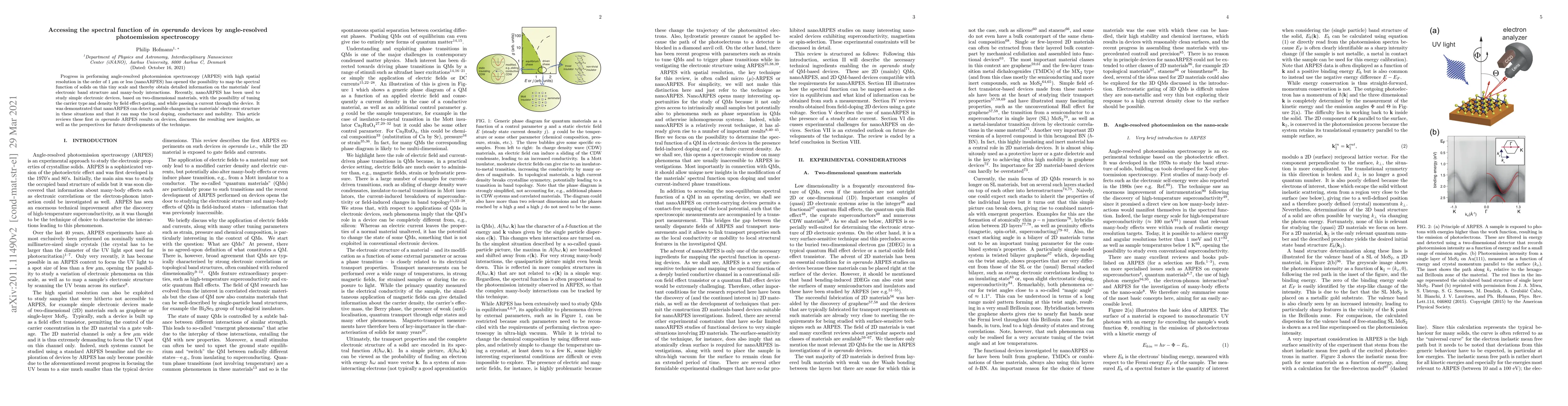 This paper reviews the application of high-resolution nanoARPES to study in operando devices, revealing local electronic structure changes, doping, and mobility, and discusses future prospects for the technique.