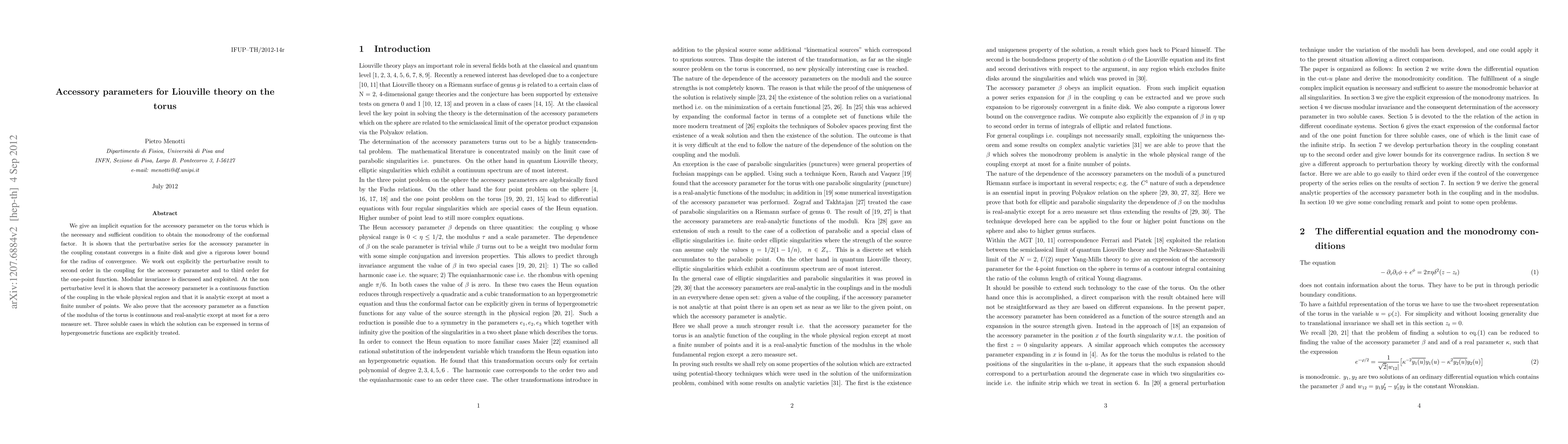 We give an implicit equation for the accessory parameter on the torus which is the necessary and sufficient condition to obtain the monodromy of the conformal factor. It is shown that the perturbative series for the accessory parameter in the coupling constant converges in a finite disk and give a rigorous lower bound for the radius of convergence. We work out explicitly the perturbative result to second order in the coupling for the accessory parameter and to third order for the one-point function. Modular invariance is discussed and exploited. At the non perturbative level it is shown that the accessory parameter is a continuous function of the coupling in the whole physical region and that it is analytic except at most a finite number of points. We also prove that the accessory parameter as a function of the modulus of the torus is continuous and real-analytic except at most for a zero measure set. Three soluble cases in which the solution can be expressed in terms of hypergeometric functions are explicitly treated.