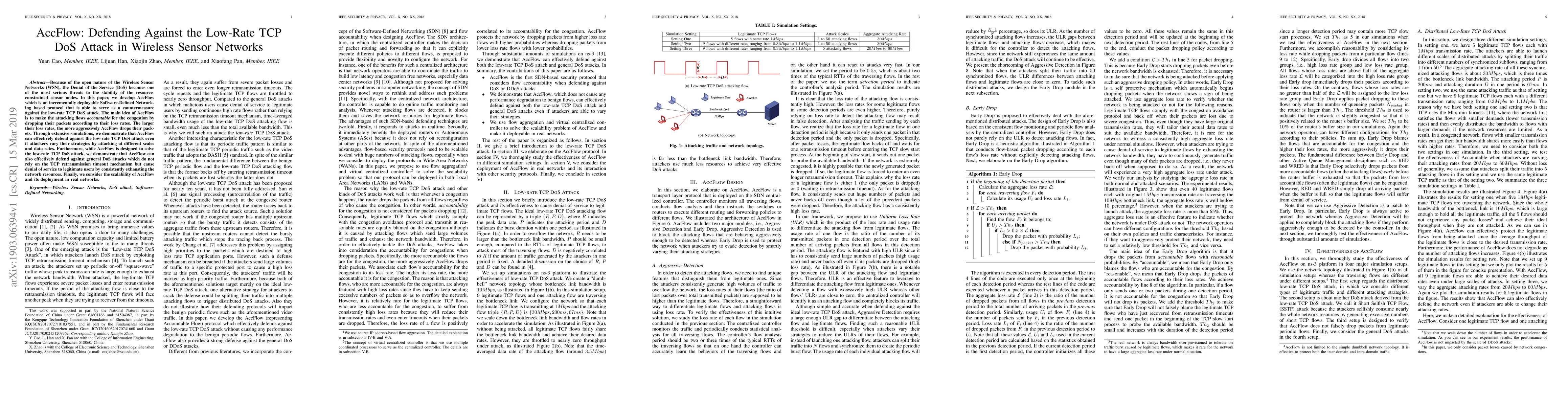 AccFlow is a Software-Defined Networking protocol designed to defend against low-rate TCP DoS attacks in Wireless Sensor Networks by making attackers accountable for congestion through packet dropping based on loss rates. It effectively counters both low-rate TCP DoS attacks and general DoS attacks by exhausting network resources.