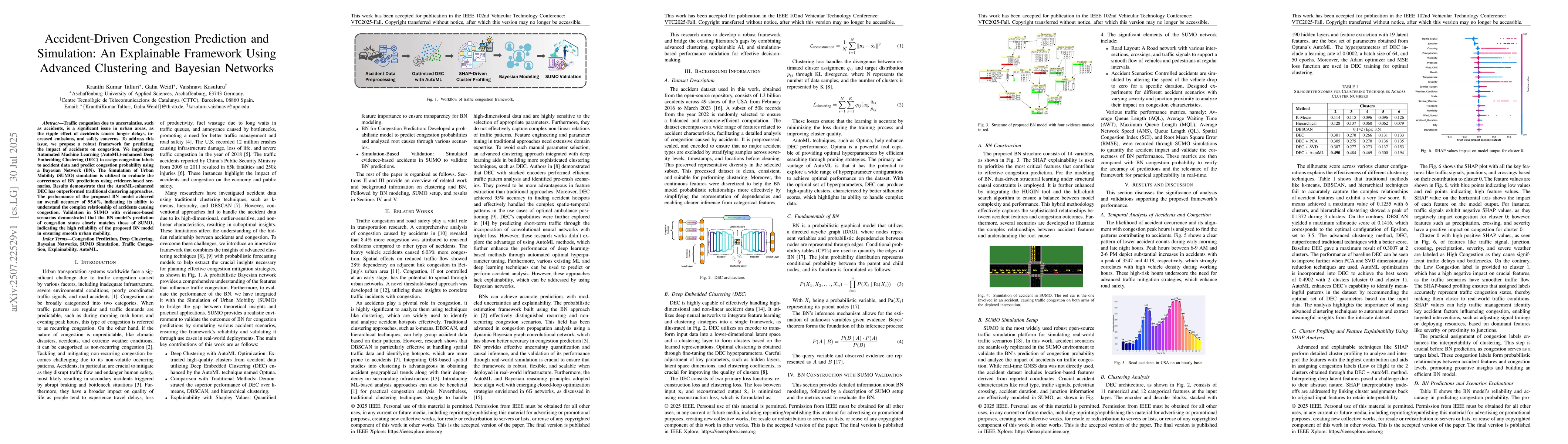 Traffic congestion due to uncertainties, such as accidents, is a significant issue in urban areas, as the ripple effect of accidents causes longer delays, increased emissions, and safety concerns. To address this issue, we propose a robust framework for predicting the impact of accidents on congestion. We implement Automated Machine Learning (AutoML)-enhanced Deep Embedding Clustering (DEC) to assign congestion labels to accident data and predict congestion probability using a Bayesian Network (BN). The Simulation of Urban Mobility (SUMO) simulation is utilized to evaluate the correctness of BN predictions using evidence-based scenarios. Results demonstrate that the AutoML-enhanced DEC has outperformed traditional clustering approaches. The performance of the proposed BN model achieved an overall accuracy of 95.6%, indicating its ability to understand the complex relationship of accidents causing congestion. Validation in SUMO with evidence-based scenarios demonstrated that the BN model's prediction of congestion states closely matches those of SUMO, indicating the high reliability of the proposed BN model in ensuring smooth urban mobility.